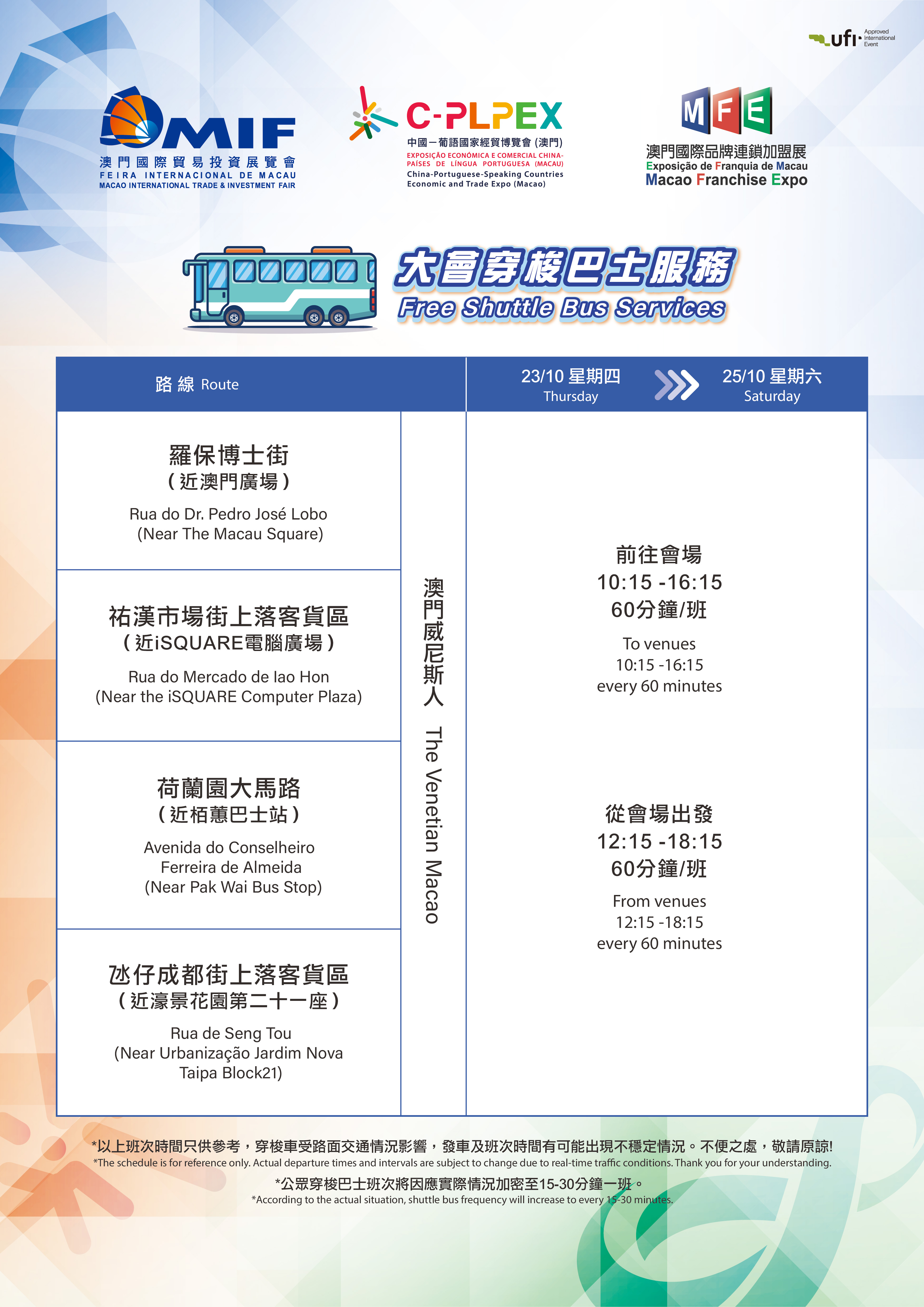 There are four free shuttle bus routes operating between the venue and several destinations in the Macao Peninsula (northern and central districts) and Taipa. For more information, please visit the official websites at www.cplpex.mo, www.mif.com.mo, or www.mfe.mo. You may also call the hotline for the 2nd C-PLPEX on (853) 2822 8289, the hotline for the 30th MIF on (853) 2882 8711, the hotline for the 2025MFE on (853) 8798 9654, or follow the WeChat account: MICE_IPIM.