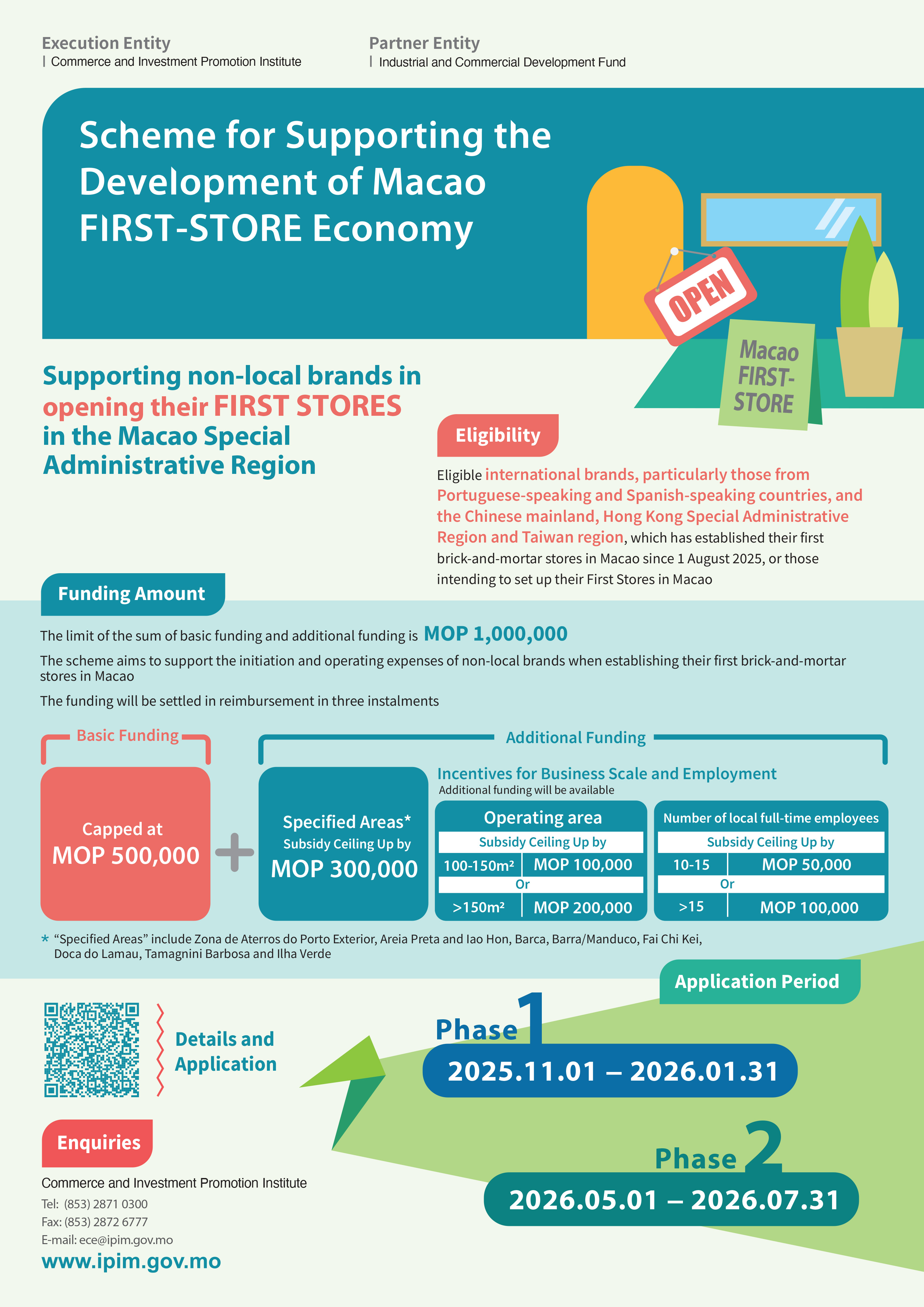 To join phase I of the “First-Story Economy Scheme”, interested parties can submit applications to IPIM in person during office hours or submit applications electronically from 1 November 2025 until 31 January 2026. For more details on the "First-Store Economy Scheme", please visit IPIM’s website at https://www.ipim.gov.mo/ or scan the QR code on the poster, or call (853) 2871 0300 or email ece@ipim.gov.mo to inquire with IPIM during office hours. Phase II of the "First-Store Economy Scheme" will accept applications from 1 May to 31 July 2026.
