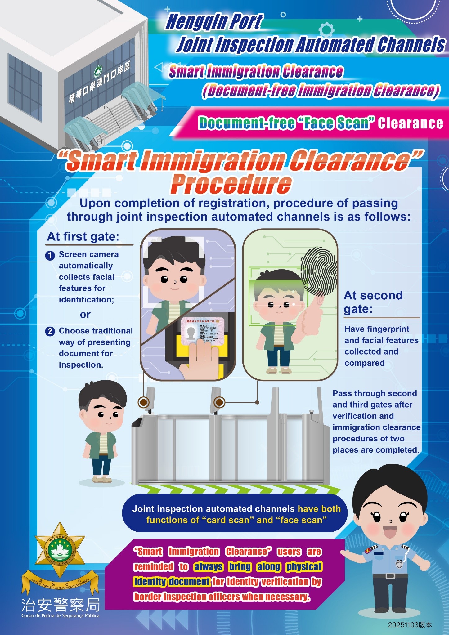 The Public Security Police Force, the Public Security Forces Affairs Bureau and the Zhuhai General Station of Exit and Entry Frontier Inspection will closely monitor the implementation of “Smart Immigration Clearance”. The three authorities will cooperate to enhance system efficacy and actively study the feasibility of extending the policy to more eligible users. Next year, the departure and arrival halls of the Hengqin Port will be equipped with 46 additional “joint inspection automated channels” that support “Smart Immigration Clearance”. It is expected that at least 65% of the inspection capacity can be increased, further enhancing immigration clearance efficiency. In the future, the border inspection authorities of Hengqin and Macao will gradually expand “Smart Immigration Clearance” to other appropriate ports and continuously explore more facilitating and diversified immigration clearance modes. The relevant authorities will take forward the construction of smart ports and promote regional integrated development in full swing.