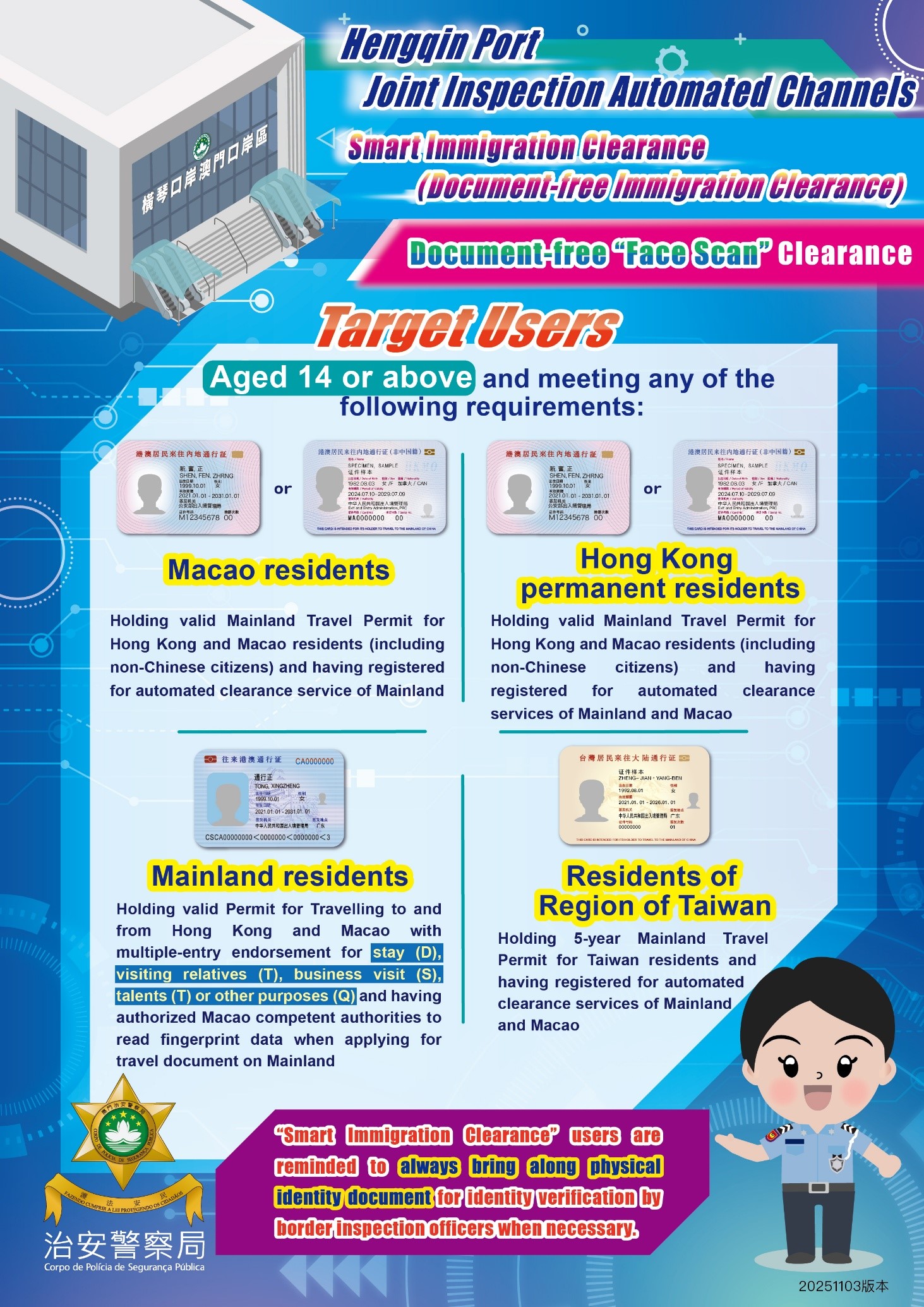 Persons using “Smart Immigration Clearance” service at the “joint inspection automated channels” of the Hengqin Port should be 14 years of age or older and should meet any of the following requirements: