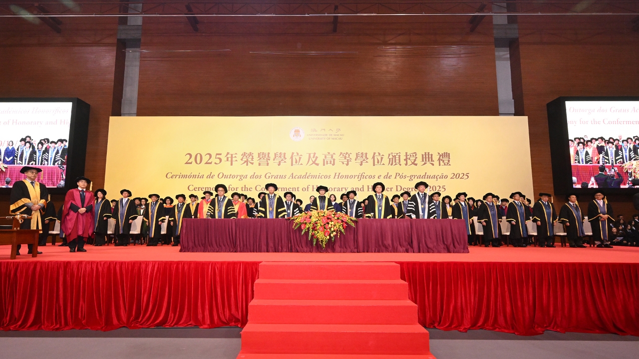 The University of Macau (UM) today (30 November) held the Ceremony for the Conferment of Honorary and Higher Degrees 2025. This year, over 2,240 students graduated from UM’s doctoral and master’s degree programmes, as well as postgraduate diploma programmes. Secretary for Social Affairs and Culture O Lam, acting as the representative of the chief executive of the Macao SAR and chancellor of UM, said that UM has not only laid a solid foundation for the development of higher education in Macao, but has also become a key force in advancing educational progress and scientific research through its remarkable achievements.