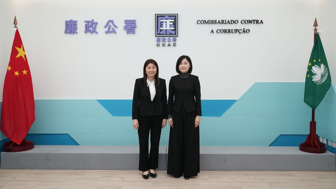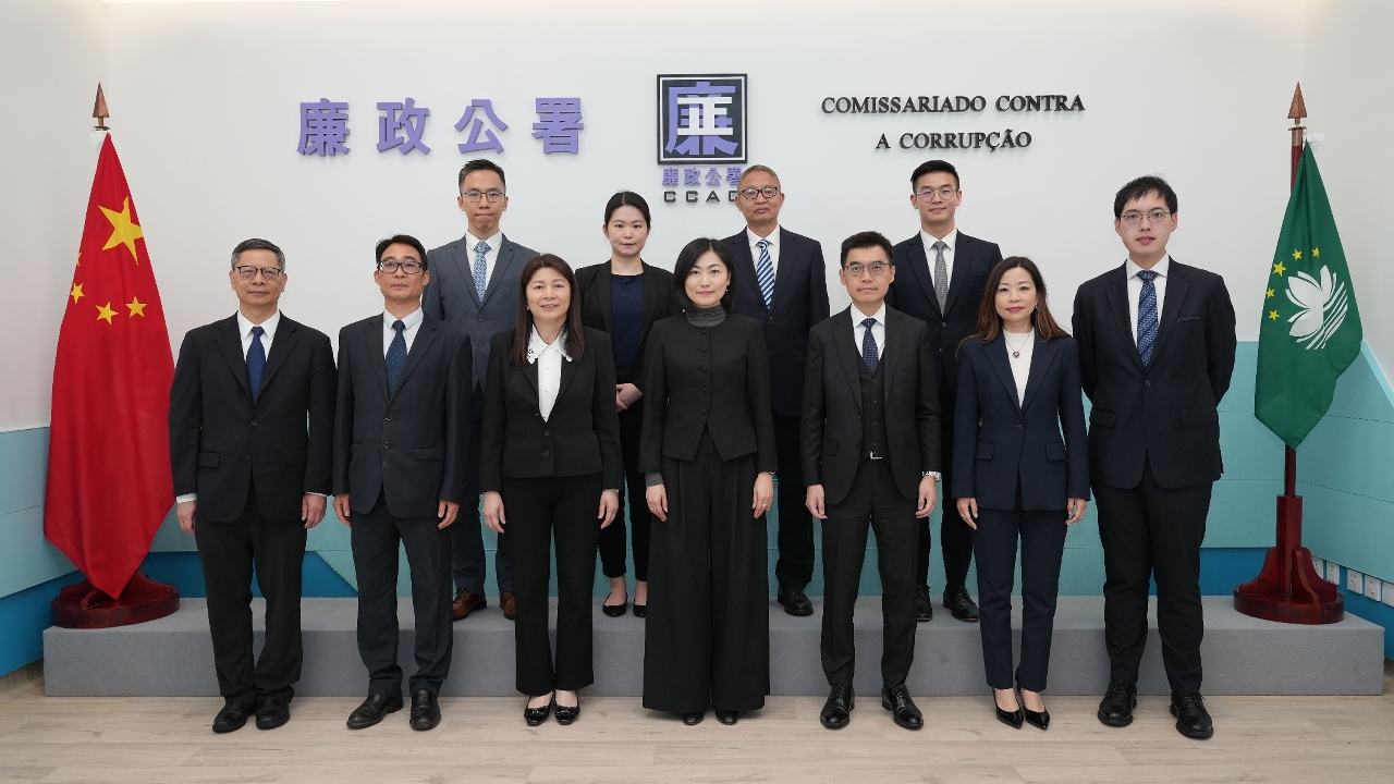 The Commissioner Against Corruption, Ao Ieong Song, welcomed a delegation from the Department of Justice led by the Director of Public Prosecutions of the Hong Kong SAR, Yang Mei Kei, at the integrity education base of the Branch Office in Taipa of the CCAC this afternoon (11th February).