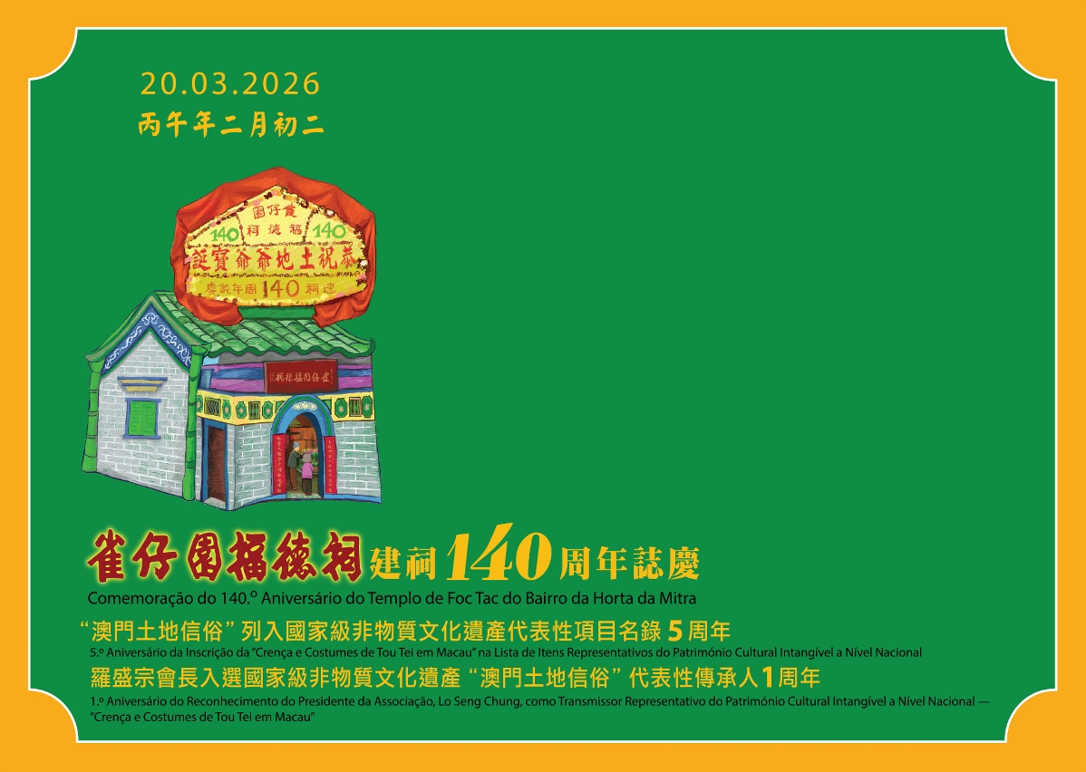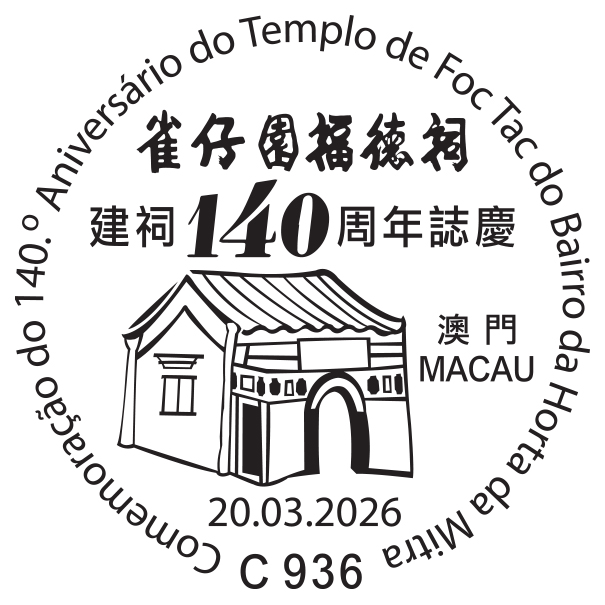 To celebrate the 140th Anniversary of Foc Tac Temple (Horta da Mitra neighbourhood), Macao Post and Telecommunications Bureau announces that a Temporary Post Counter will be set up at the Foc Tac Temple (Horta da Mitra neighbourhood), Rua de Tomás da Rosa from 10:00 to 14:00 on 20th March 2026, to provide the commemorative postmark cancellation service for the “140th Anniversary of Foc Tac Temple (Horta da Mitra neighbourhood)”.