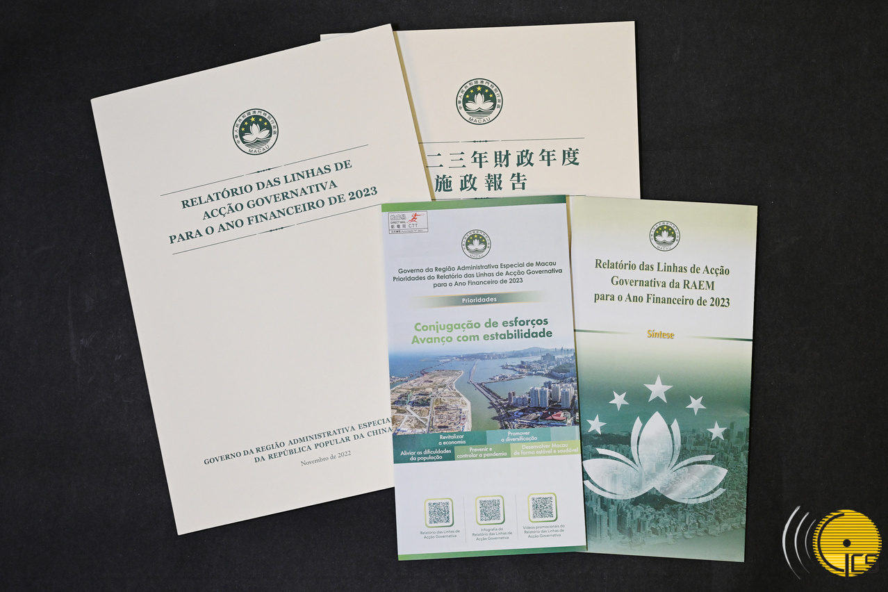 • Exemplares e panfletos do Relatório das Linhas de Acção Governativa para o Ano Financeiro de 2023 disponíveis ao público em vários locais.