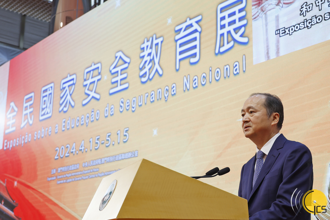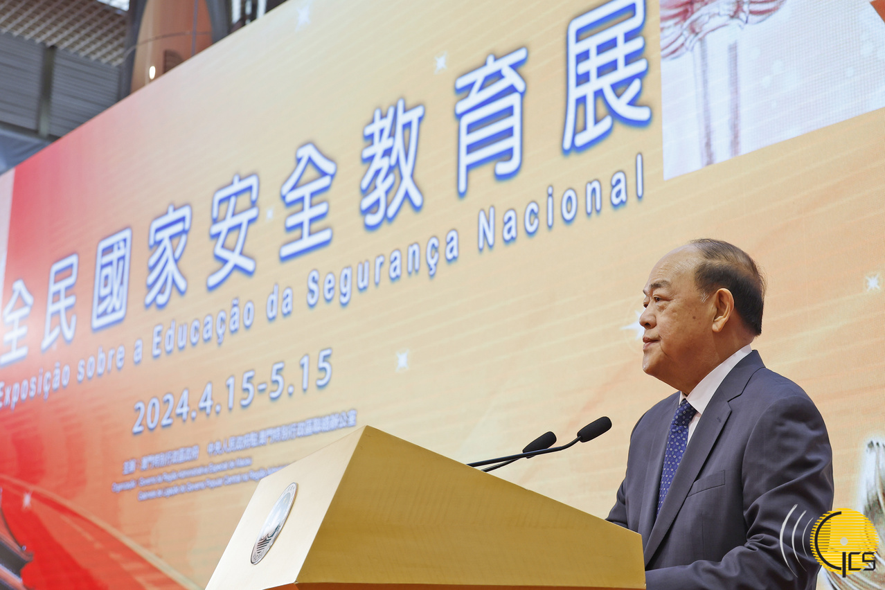 • Presidente da Comissão de Defesa da Segurança do Estado da Região Administrativa Especial de Macau e Chefe do Executivo, Ho Iat Seng, discursa na cerimónia de inauguração da «Exposição sobre a Educação da Segurança Nacional» de 2024.