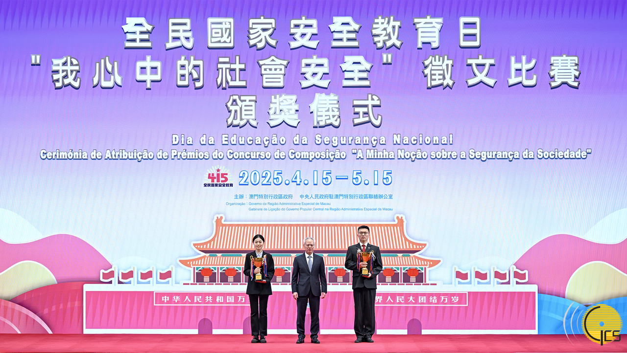 • Chefe do Executivo e Presidente da Comissão de Defesa da Segurança do Estado da Região Administrativa Especial de Macau, Sam Hou Fai, entrega prémios aos alunos do ensino superior vencedores do concurso de composição“A minha noção sobre a segurança da sociedade”.