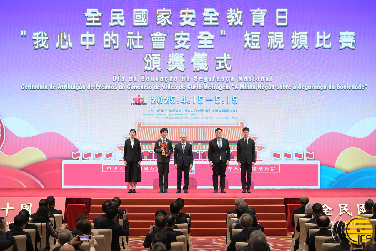 • Chefe do Executivo e Presidente da Comissão de Defesa da Segurança do Estado da Região Administrativa Especial de Macau, Sam Hou Fai, entrega prémios aos alunos do ensino superior vencedores do concurso de vídeo de curta-metragem“A minha noção sobre a segurança da sociedade”.