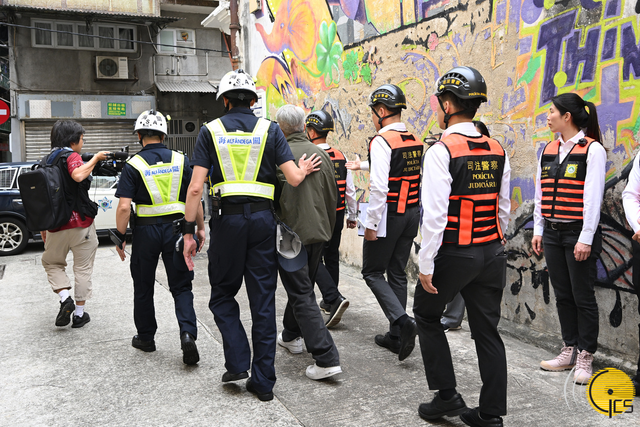• Exercício de protecção civil «Peixe Cristal 2025» - Agentes da Alfândega de Macau e da Polícia Judiciária ajudam os residentes depois de os convencer a deixarem a zona e seguirem para local seguro.