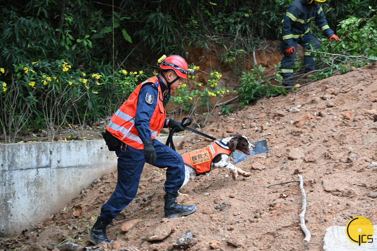 Exercício de protecção civil «Peixe Cristal 2025» - Execução do «plano de contingência específico para derrocada de montanha, deslizamento de terras ou fluxo de escombros» e busca e salvamento pela equipa de cães-polícia.
