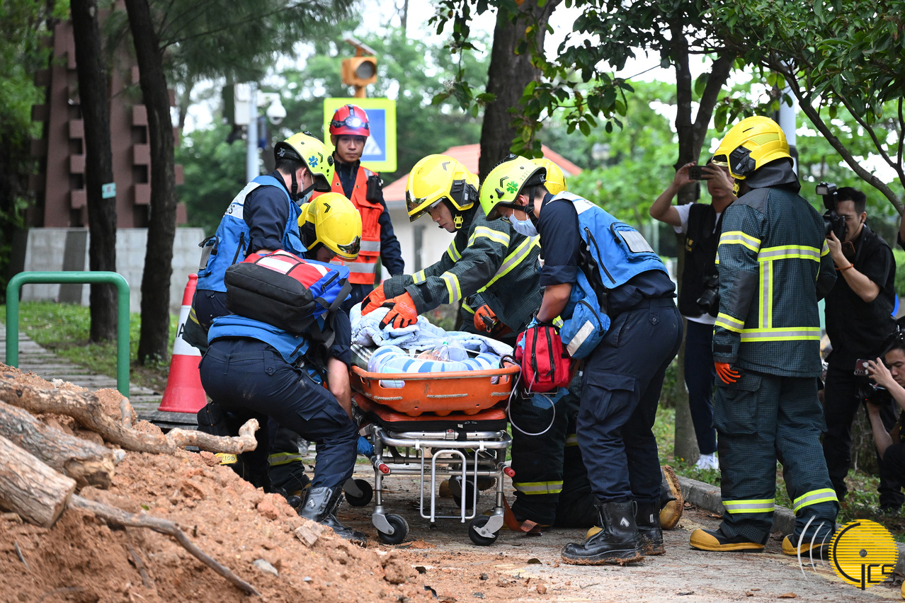 • Exercício de protecção civil «Peixe Cristal 2025» -Bombeiros e cães-polícia resgataram as pessoas soterradas em deslizamento de terras e os bombeiros procedem de imediato à avaliação e tratamento méidco.
