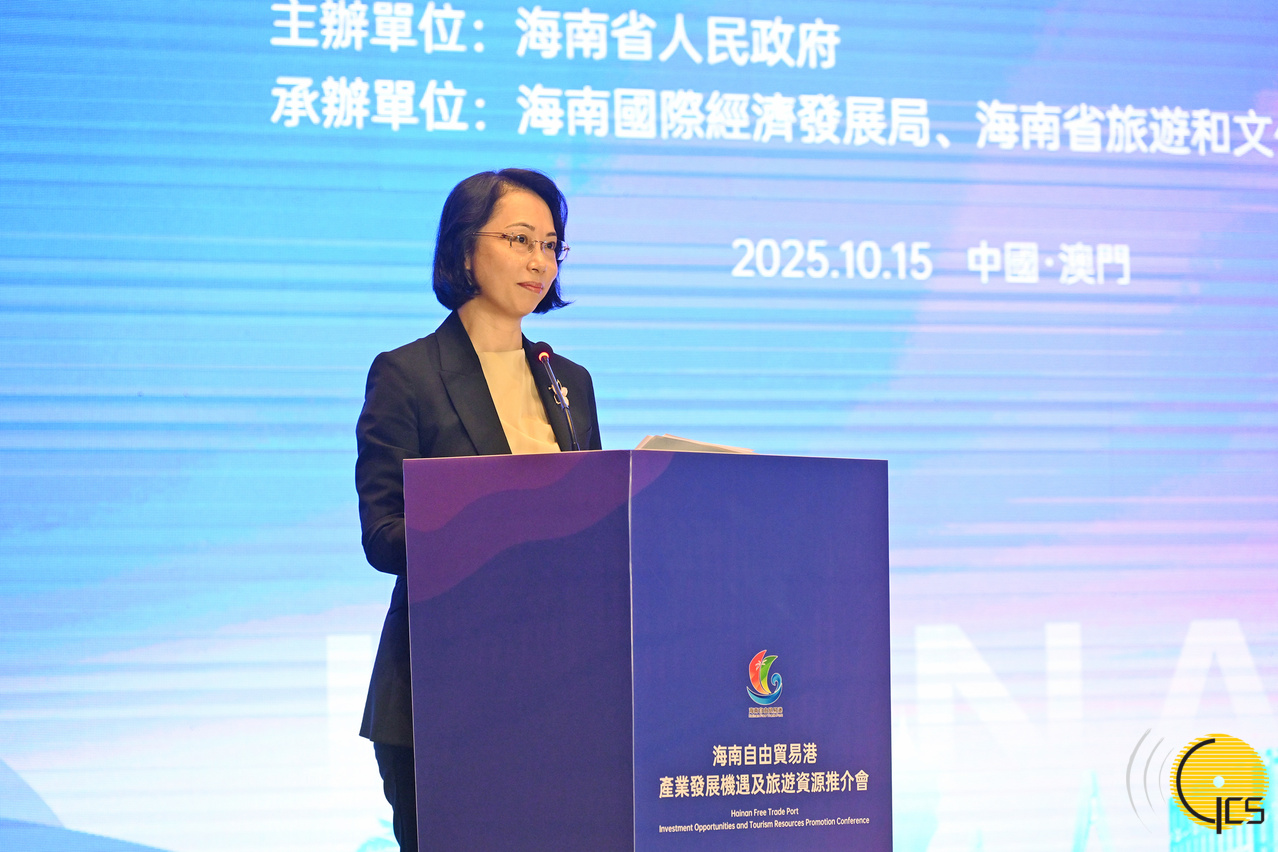 Secretária para os Assuntos Sociais e Cultura, O Lam , na sessão de promoção das oportunidades de desenvolvimento industrial e dos recursos turísticos do Porto de Livre Comércio de Hainão em Macau, realizada pelo Governo Provincial de Hainão.