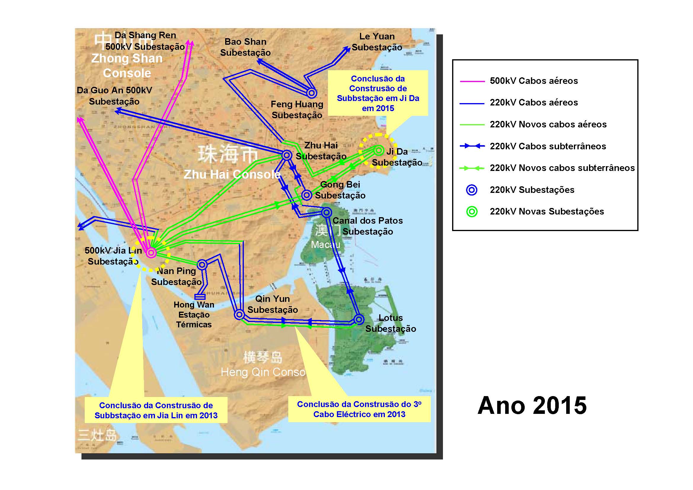 O “Plano de Transmissão Eléctrica, a médio e longo prazo, da China Southern Power Grid Corporation Ltd. para Macau” irá servir de base para os estudos da previsão da procura em 2015 e, de acordo com o grau de desenvolvimento da carga da Região de Macau nos últimos anos do Décimo Primeiro Ano Quinquenal, fez-se o ajustamento das previsões da carga dos vários planos anuais, aproximando-se mais da situação actual e concreta. O volume de electricidade que a CSPGC transmite para Macau, a partir de 2005 até 2020, em cada cinco anos, o aumento médio anual corresponde a 52,7%, 15,6% e 2,3%. Relativamente à carga máxima de fornecimento de electricidade a transmitir para Macau, de cinco em cinco anos, o aumento médio anual corresponde a 27,8%, 16,4% e 2,3%. Por outro lado, com base nestas percentagens são efectuadas as análises sensíveis e correspondentes para o projecto