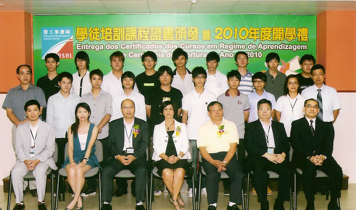 Os cursos em regime de aprendizagem são cursos de formação inicial destinados especialmente aos jovens. A cerimónia de entrega dos certificados e a abertura destes cursos para o ano lectivo de 2010 foi realizada a semana passada no Centro Industrial “Ocean” do Departamento de Formação Profissional da Direcção dos Serviços para os Assuntos Laborais (DSAL), tendo contado com a presença da Directora Substituta, Dra. Noémia Lameiras, do Vogal de Júri de Exame da Avaliação de Capacidade Profissional do Curso de Formação, Dr. Cheong Man Fun, do Chefe de Departamento de Formação Profissional, Dr. Hung Ling Biu e dos formandos das 12ª à 14ª edições dos Cursos de Aprendizagem.