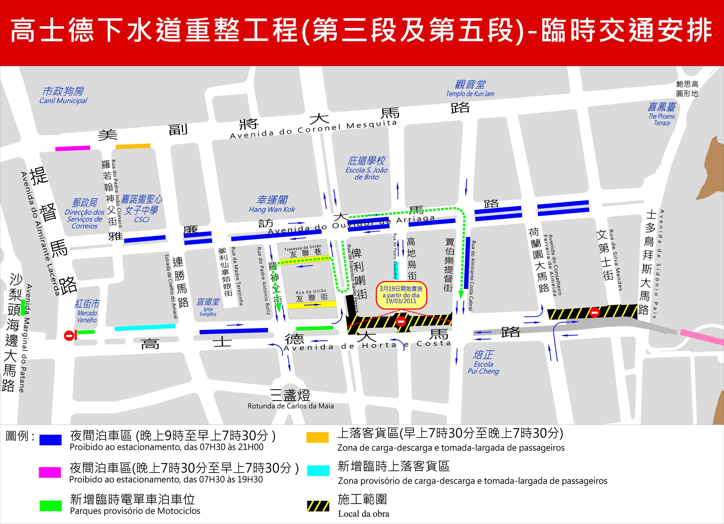 Por outro lado, tendo em conta o impacto ao trânsito durante a execução da obra, a DSAT irá adoptar uma série de medidas no sentido de atenuar o trânsito, incluindo a proibição dos veículos de comprimento superior a 7m entrar o troço da Rua de Francisco Xavier Pereira, compreendido entre Avenida do Ouvidor Arriaga e Avenida de Horta e Costa, com excepto os veículos da obra e dos serviços de urgência. E será invertido o sentido do trânsito da Travessa da União e da Rua da União, e o trânsito da Rua de Manuel de Arriaga somente poderá virar à esquerda em direcção da Avenida de Horta e Costa. A par disso, serão desactivados alguns lugares de estacionamento localizados na Rua do Almirante Costa Cabral e na Rua do Padre António Roliz, junto do Banco de Tai Fung, contudo, em substituição será permitido o estacionamento durante o período nocturno no troço da Avenida de Horta e Costa, compreendido entre a Estrada de Coelho do Amaral e a Rua do Padre António Roliz. A par disso, será ainda criado no troço da Avenida de Horta e Costa, compreendido entre a Rua do Padre António Roliz e a Rua de Francisco Xavier Pereira, uma zona provisória para o estacionamento de motociclos, no sentido de fazer face às necessidades dos cidadãos em termos de estacionamento.