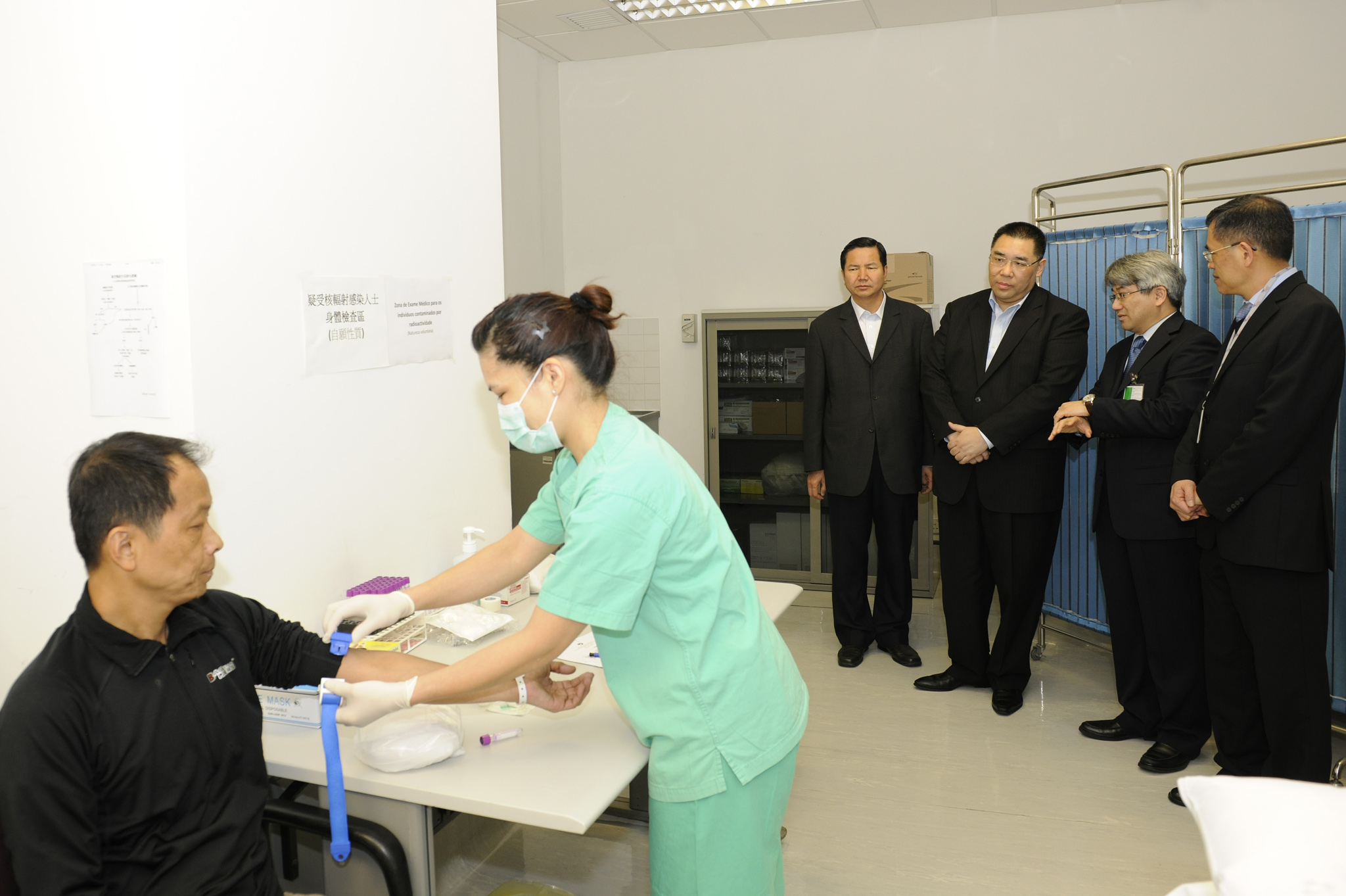 Cheong Kuoc Vá, secretário para a Segurança, Cheong U, secretário para os Assuntos Sociais e Cultura, Alexis Tam, Chefe do Gabinete do Chefe do Executivo, O Lam, secretária-geral do Conselho Executivo e assessora do Gabinete do Chefe do Executivo, Costa Antunes, director dos Serviços de Turismo, Lei Sio Peng, comandante do Corpo da Polícia de Segurança Pública acompanharam Chui Sai On na visita ao posto de controlo de contaminação radioactiva no aeroporto.