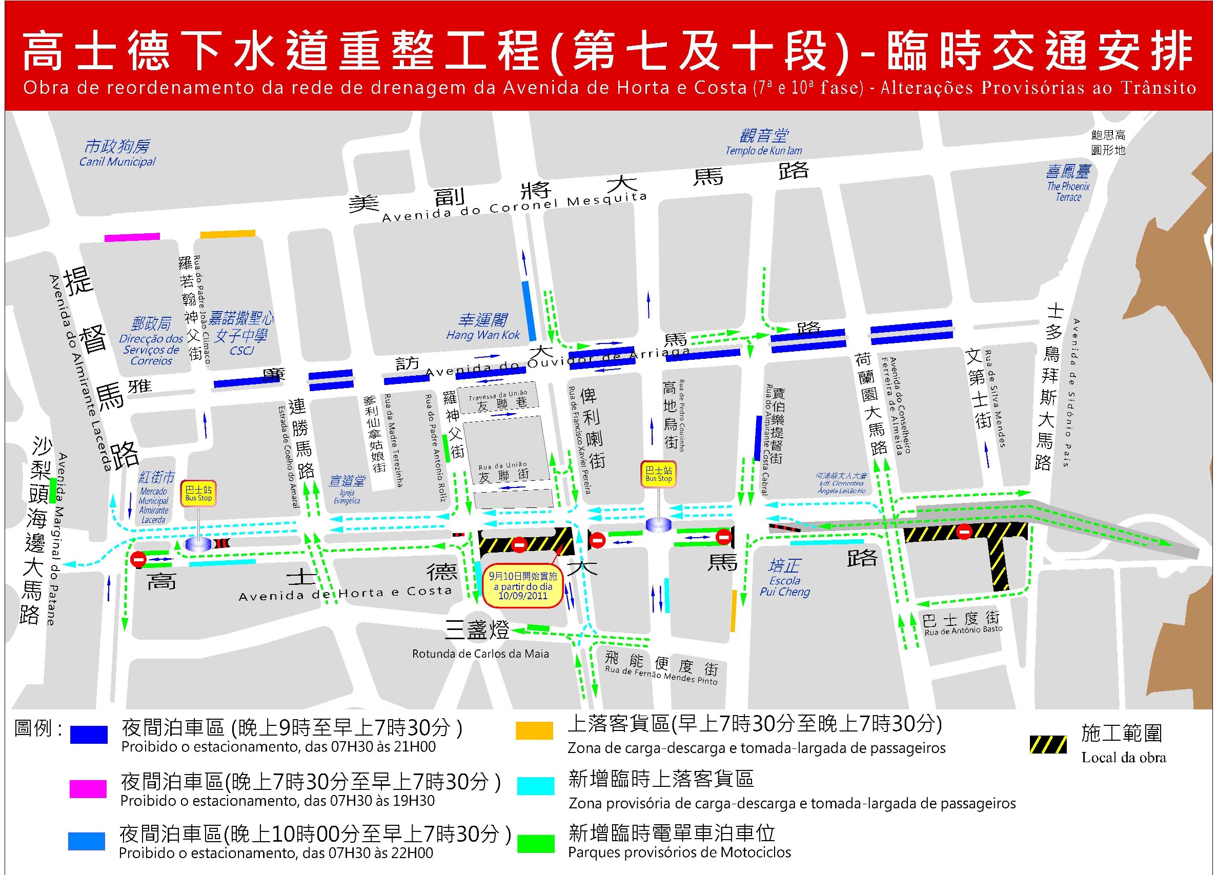 Actualmente encontra-se em curso a execução dos trabalhos junto do cruzamento formado entre a Avenida de Horta e Costa e a Rua de Francisco Xavier Pereira, junto do Centro Comercial Pereira Plaza. Atendendo ao impacto da execução destes trabalhos ao trânsito envolvente da Avenida de Horta e Costa, veio a Administração após avaliar a situação do trânsito nos primeiros dois dias após o início dos respectivos trabalhos introduzir várias alterações no condicionamento de trânsito nestes troços, incluindo a instalação de sinalização semafórica nestes troços e abertura antecipada destes troços ao trânsito, no intuito de permitir melhor desviar e descongestionar o trânsito. A DSSOPT e a DSAT agradece pela compreensão e pelo apoio prestados pela população, pelo que irão continuar com a boa execução destes trabalhos e instigar o empreiteiro a acelerar a execução destes trabalhos, no sentido de procurar concluir os trabalhos nestes cruzamentos até a 2.ª metade do corrente mês, de modo a minimizar na medida dos possíveis o impacto causado ao trânsito devido a execução destes trabalhos.