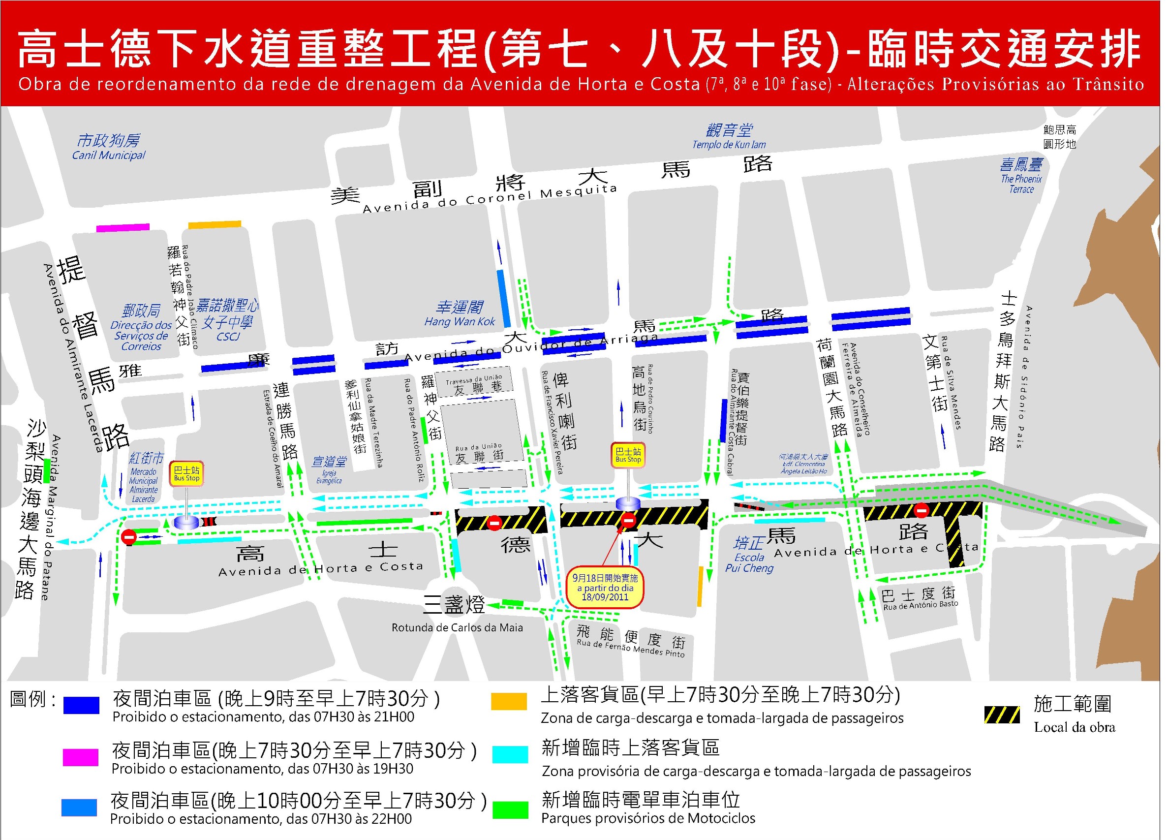Com o início a partir das 9:00 horas do próximo domingo da execução dos trabalhos do 8.º troço, compreendido entre a Rua de Francisco Xavier Pereira e a Rua do Almirante Sacadura Cabral, que marca igualmente o arranque dos trabalhos do último troço da Obra de Reordenamento da Rede de Drenagem da Avenida de Horta e Costa, a zona provisória para o estacionamento de motociclos deste troço será mudada para o troço da Avenida de Horta e Costa em frente do Edifício Grand Oceania. A DSSOPT e a DSAT agradecem novamente o apoio e a compreensão prestados desde sempre pela população, pelo que além de se continuar com a boa execução dos respectivos trabalhos, envidar-se-á também tendo em conta as necessidades da deslocação da população os esforços para que na medida dos possíveis seja provisoriamente aberta ao trânsito rodoviário ainda no corrente ano, de modo a minimizar assim ao máximo o impacto da obra ao trânsito.