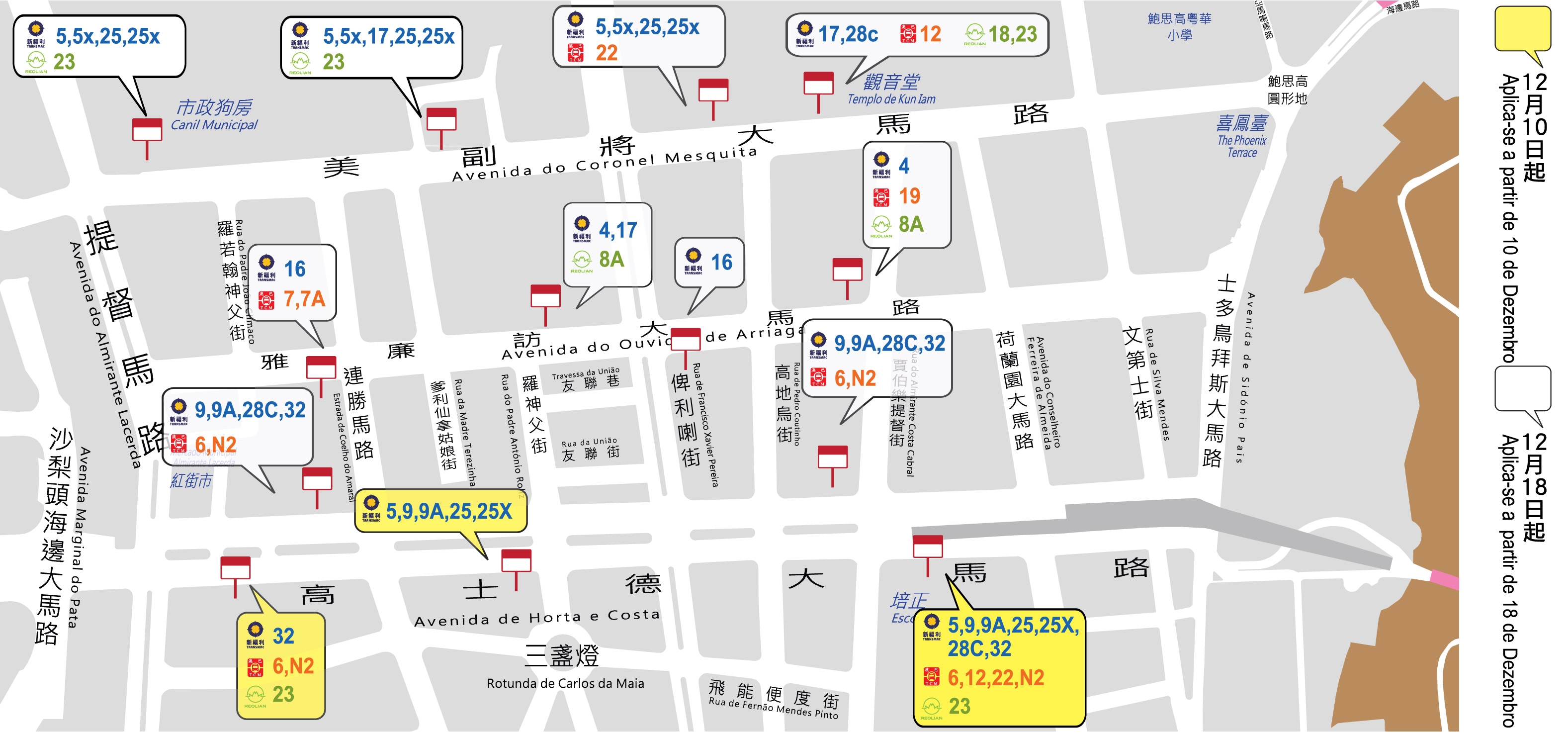 Por outro lado, considerando que as carreiras de autocarros que passaram a circular, durante o período de execução das obras, na Avenida do Coronel Mesquita e Avenida do Ouvidor Arriaga conseguiram desempenhar um papel escoador e repartidor do trânsito, produzindo um efeito positivo nos serviços de autocarros, a partir de 18 de Dezembro, as carreiras n.ºs 5 (para a Barra) que segue para a Guia, 5X e 12 (para o Terminal Marítimo do Porto Exterior), 17 (para o Centro Cultural), 18 (para as Portas do Cerco), 22 (para a Taipa), 23 (para a Torre de Macau), 25 (para a Taipa), 25X (para a Taipa) e 28C (para as Portas do Cerco) continuam a circular na Avenida do Coronel Mesquita; as carreiras n.ºs 6 (para Praça de Serenidade), 9 (para a Barra), 9A (para a Torre de Macau), 28C (para a Pelota Basca), 32 (para a Torre de Macau) e N2 (para a Taipa) vão circular na Avenida de Horta e Costa; e as carreiras n.ºs 4 (para a Avenida de Almeida Ribeiro), 8A (para a Avenida de Almeida Ribeiro), 17 (Para a Praça de Luís de Camões) e 19 (para a Avenida de Almeida Ribeiro) vão circular na Avenida do Ouvidor Arriaga. A Avenida de Horta e Costa do lado do Mercado Vermelho só mantém duas paragens, a “Horta e Costa/Estrada Coelho do Amaral” e “Horta e Costa/Rua Almirante Costa Cabral”, com o intuito de acelerar a velocidade do movimento dos autocarros.