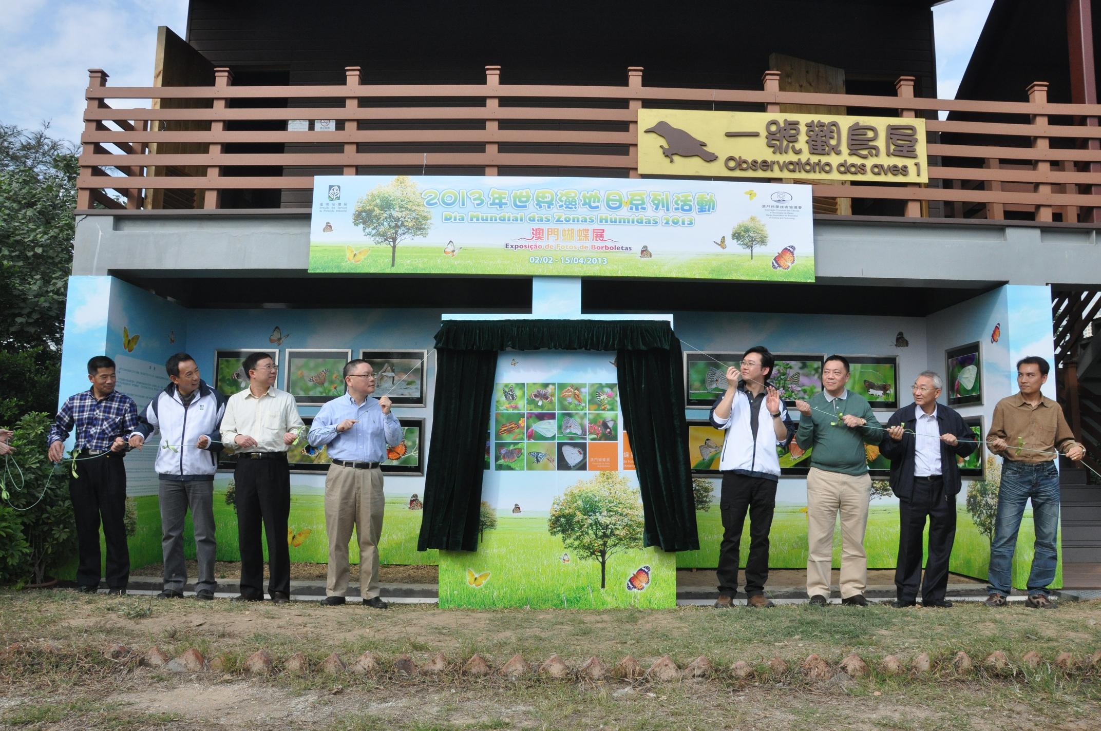 Para comemorar o “Dia Mundial das Zonas Húmidas 2013” em 2 de Fevereiro, com o objectivo de reforçar o conceito da população sobre a preservação ecológica e a protecção ambiental e a concretização conjunta da visão de transformar “Macau, num centro de baixo carbono. Criar em conjunto uma vida ecológica”, no seguimento da realização da exposição de aves do ano passado, para este ano, a Direcção dos Serviços de Protecção Ambiental (DSPA) e a Associação Promotora das Ciências e Tecnologias de Macau organizam, em conjunto, uma série de actividades do “Dia Mundial das Zonas Húmidas”. Hoje (dia 2 de Fevereiro) à tarde, às 15h00 horas, foi realizada, na Zona Ecológica, no COTAI, a cerimónia de inauguração da Exposição de Fotos de Borboletas, onde são exibidas no total 150 excelentes obras, expondo as posturas deslumbrantes das borboletas.