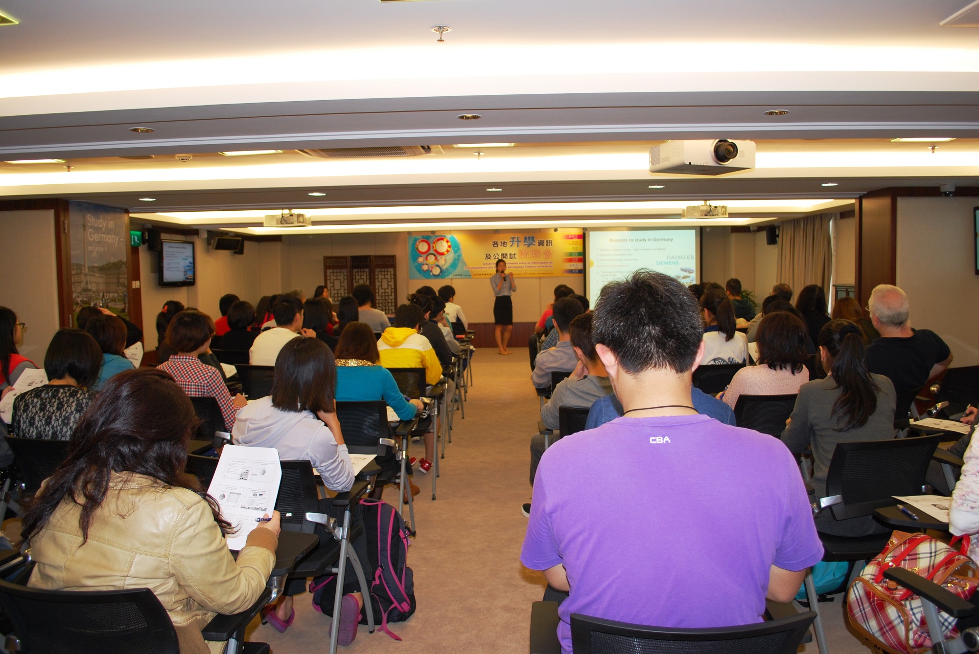 O GAES, entre os meses de Março e Junho deste ano, realizou, sucessivamente, nove Sessões de Esclarecimento, com diversos temas, sobre o prosseguimento dos estudos e os exames públicos, nelas se incluindo as sessões sobre o Interior da China, Portugal, Austrália, Alemanha, Reino Unido, Canadá e Estados Unidos da América. Foram nossos convidados os representantes de diversas entidades, como o Ministério da Educação da China, o Consulado-Geral de Portugal em Macau, o Consulado-Geral da Austrália em Hong Kong, Deutscher Akademischer Austauschdienst (Serviço Alemão de Intercâmbio Académico), o Conselho Britânico em Hong Kong, o Consulado-Geral do Canadá em Hong Kong, bem como a Education USA, para apresentarem aos participantes os seus sistemas educativos, os requisitos de acesso ao ensino, as propinas, as formalidades de candidatura às bolsas de mérito, bem como outras informações relacionadas com o prosseguimento dos estudos. Este ano, foi adicionada a sessão de partilha com antigos alunos, para a qual convidámos os antigos alunos de Macau que estudaram nas regiões mencionadas, para parilharem, com os participantes, as suas experiências de aprendizagem e situações da vida diária. Para além destas, foram, ainda, realizadas sessões de esclarecimento sobre o TOEFL (Teste de Inglês como Língua Estrangeira) e sobre o IELTS (Sistema Internacional de Teste da Língua Inglesa), tendo sido, também, nossos convidados os representantes do Centro de Língua Inglesa, da Universidade de Macau, e do Centro de Inglês IPM-Bell, do Instituto Politécnico de Macau, para nos falarem, entre outros assuntos, sobre o reconhecimento, formas e observação dos exames.