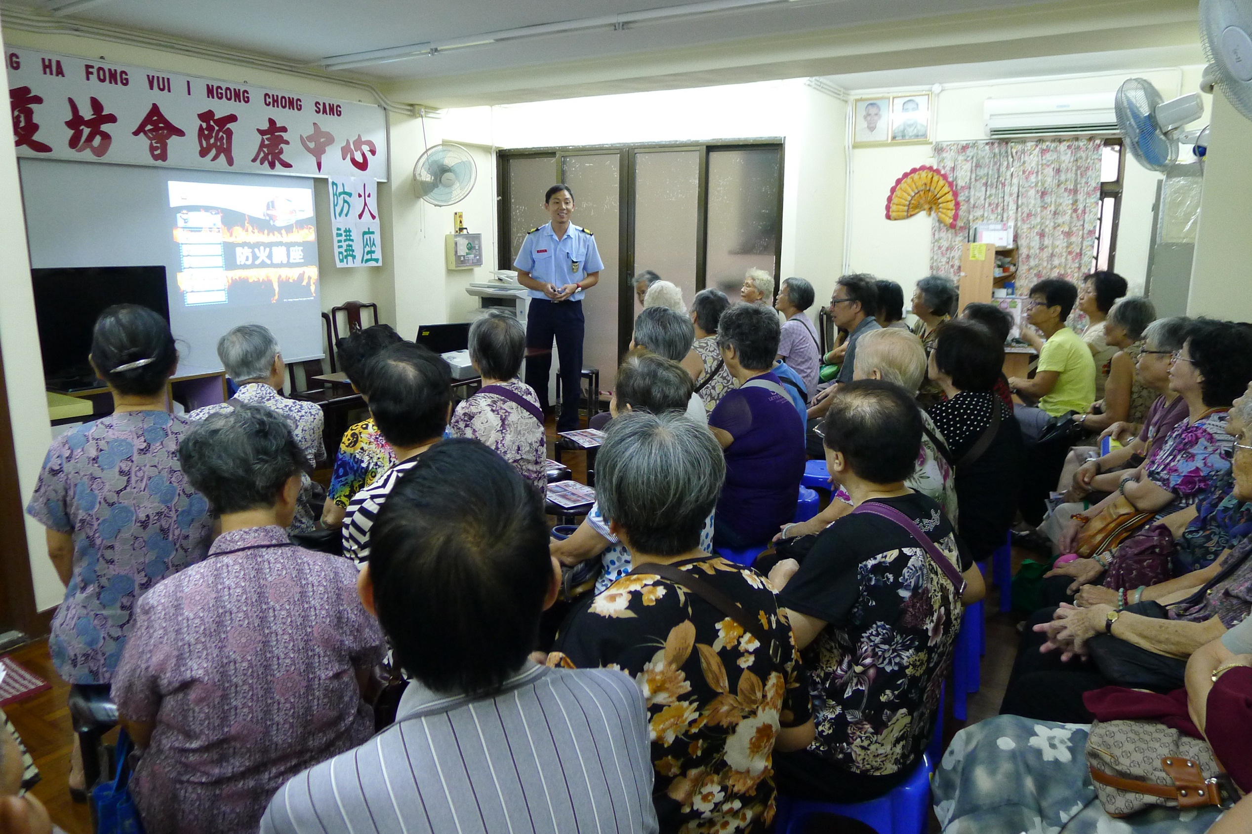 As acções acima mencionadas executam-se entre os dias 11 e 18 de Setembro do corrente ano, e distribuem-se os panfletos e cartazes aos cidadãos da Zona Norte, Zona dos Aterros do Porto Exterior e Zona da Taipa. Além do mais, o CB enviou os seus oficiais para visitarem a Associação de Mútuo Auxílio dos Moradores de Mong-Há e a Associação de Mútuo Auxílio do Bairro, abrangendo a Rua da Praia do Manduco, respectivamente, nos dias 11 e 13 do corrente mês, durante as visitas, ambas as partes discutiram e trocaram opiniões sobre as tarefas alusivas à prevenção contra o fogo, combate a incêndios e socorro nas respectivas zonas. Simultaneamente, os oficiais desta Corporação realizaram também uma palestra sobre a prevenção do fogo destinada aos membros da Associação de Mútuo Auxílio dos Moradores de Mong-Há, e distribuíram os materiais publicitários de prevenção contra incêndios dentro da zona, com o apoio dos voluntários da mesma.