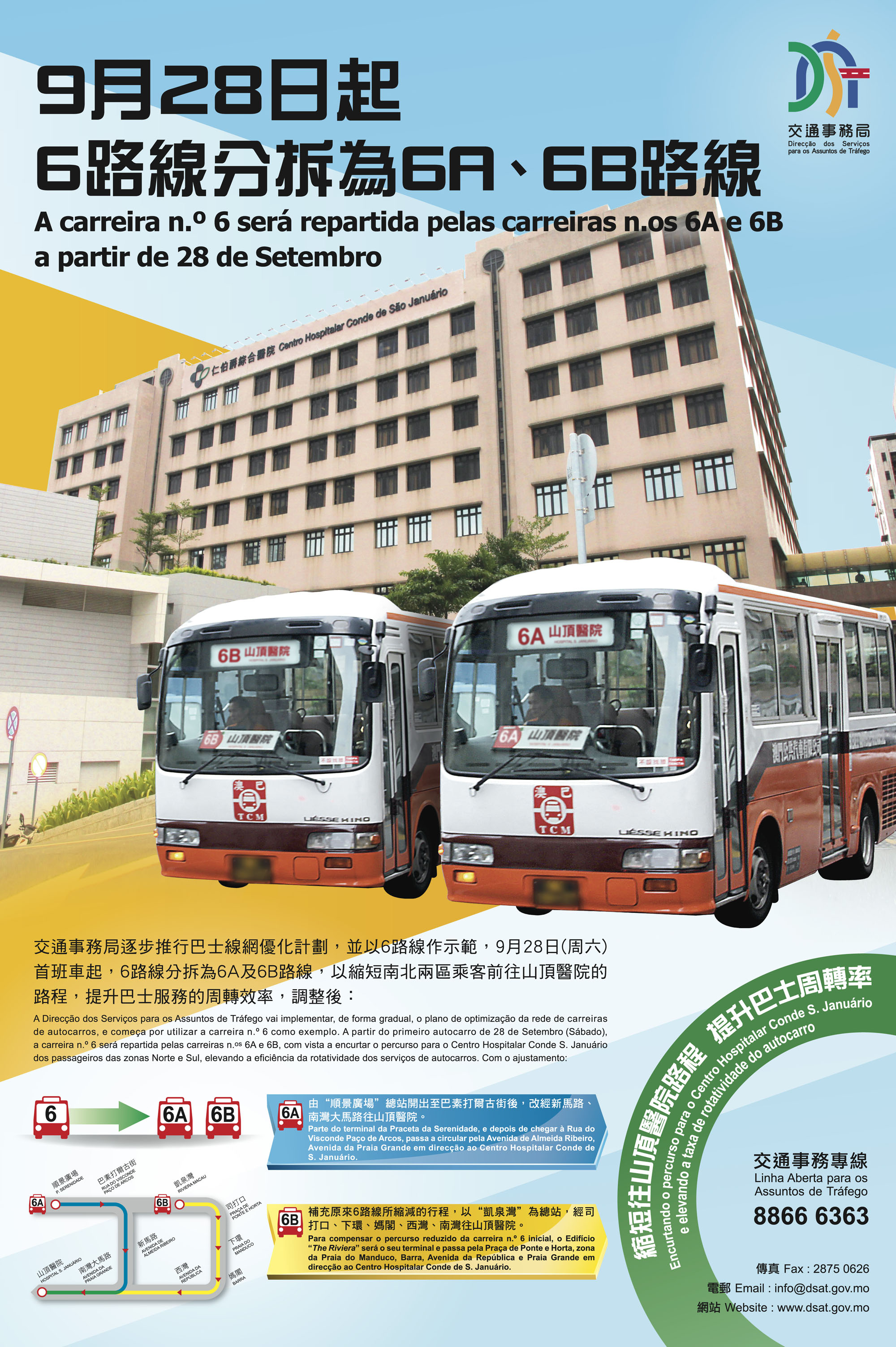 A partir do primeiro autocarro de amanhã (28 de Setembro), a carreira n.o 6 será repartida pelas carreiras n.os 6A e 6B. A carreira n.o 6A, depois de chegar à Rua do Visconde Paço de Arcos, passa a circular pela Avenida de Almeida Ribeiro e Avenida da Praia Grande em direcção ao Centro Hospitalar Conde de S. Januário. A seguir, regressa ao terminal da Praceta da Serenidade conforme o itinerário inicial; a carreira n.o 6B parte do terminal do Edifício “The Riviera” e dirige-se para o Centro Hospitalar Conde de S. Januário através de Sai Van e Praia Grande, encurtando o percurso dos passageiros das zonas Norte e Sul para este hospital. A Direcção dos Serviços para os Assuntos de Tráfego apela aos passageiros para prestaram atenção às respectivas alterações. Na fase inicial do ajustamento da carreira, a DSAT vai destacar assistentes de trânsito em algumas paragens, para distribuir folhetos informativos e prestar esclarecimentos sobre as carreiras aos passageiros