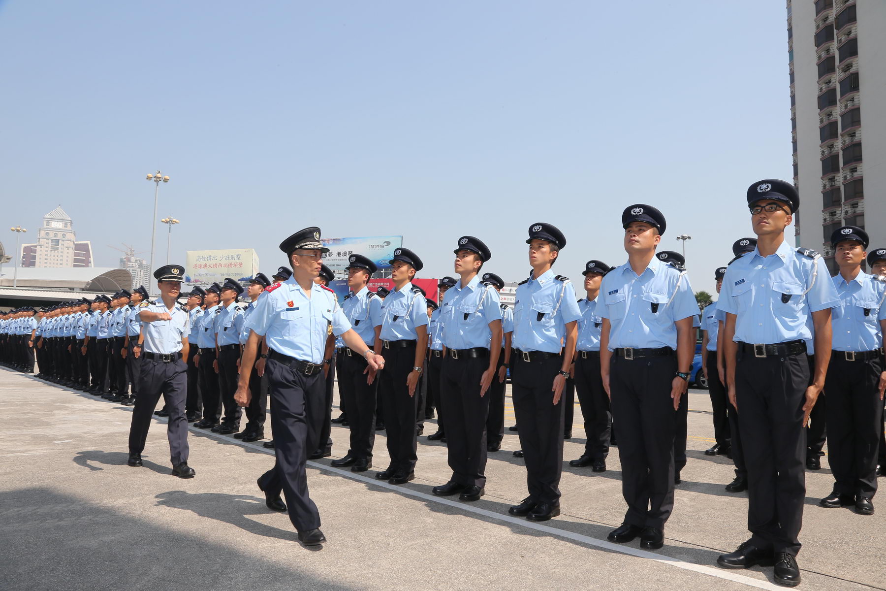 Uma cerimónia de tomada de posse de novos agentes. A cerimónia foi presidida pelo Exmo Sr. Comandante do CPSP, Superintendente Geral Lei Siu Peng, 2ºs Comandantes, Superintendente Lai Kam Kun e Superintendente Mui San Meng, e com a presença de chefias e responsáveis de vários Departamentos desta Corporação, onde foi efectuada a imposição das respectivas divisas aos novos agentes policiais, seguido de juramento como prontos para servir a RAEM.