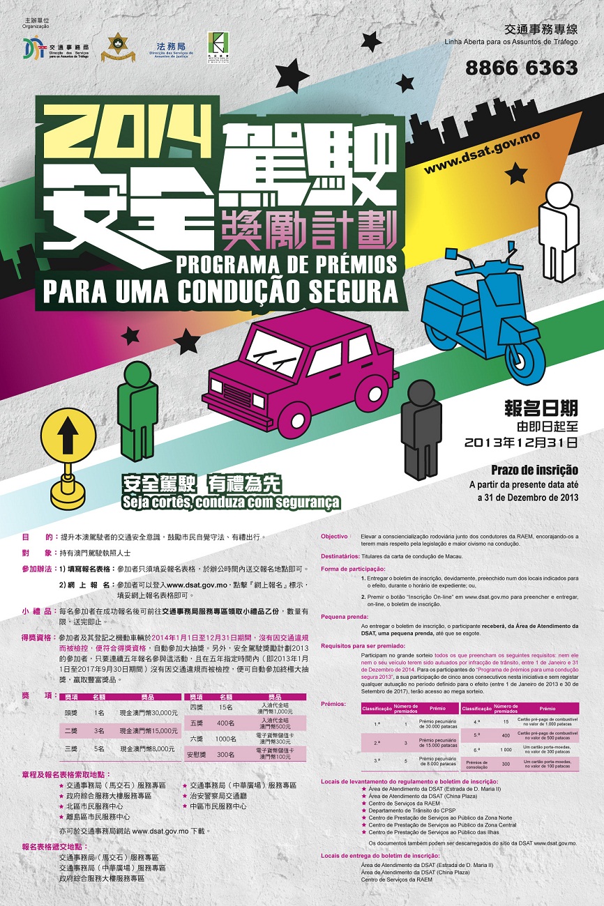 O Programa de Prémios para uma Condução Segura 2014, iniciativa conjunta da DSAT, CPSP, DSAJ e IACM, tem como slogan “Seja cortês, conduza com segurança” e pretende elevar a consciência da segurança rodoviária dos condutores, para que efectuem as suas deslocações respeitando a lei e os outros utentes.