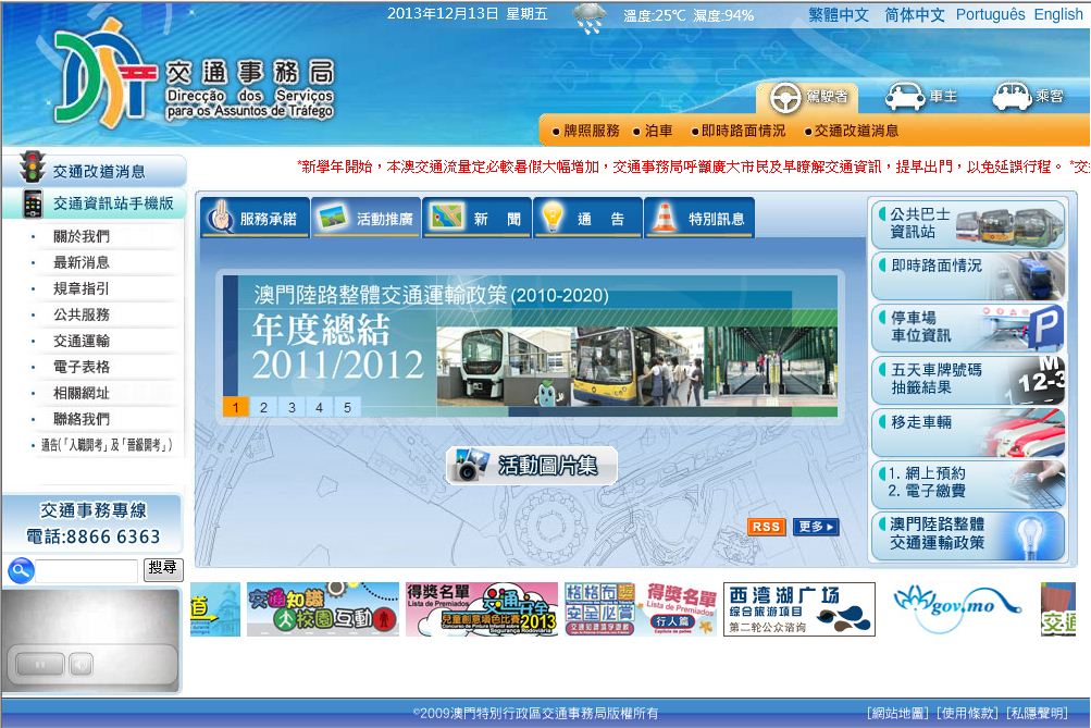 A partir de hoje, o balanço geral do ano 2011/2012 da “Política Geral de Trânsito e Transportes Terrestres (2010-2012)” pode ser descarregado, através da página electrónica da Direcção dos Serviços para os Assuntos de Tráfego. O documento relembra o trabalho feito desde a implementação da Política que tem como objectivo, na primeira fase, o “reordenamento dos transportes públicos, concentrando a atenção na salvaguarda das deslocações”, dando prioridade ao reordenamento do sistema de transportes públicos e à aplicação das respectivas medidas de melhoria, no sentido de tentar salvaguardar a conveniência e o conforto no “commuting” (casa-trabalho e trabalho-casa) e outras deslocações dos cidadãos, através da melhoria do espaço pedonal e de outras medidas de apoio, para além de fazer, ao mesmo tempo, uma boa preparação e arranjo em articulação com a execução das obras da 1.a fase do metro ligeiro.