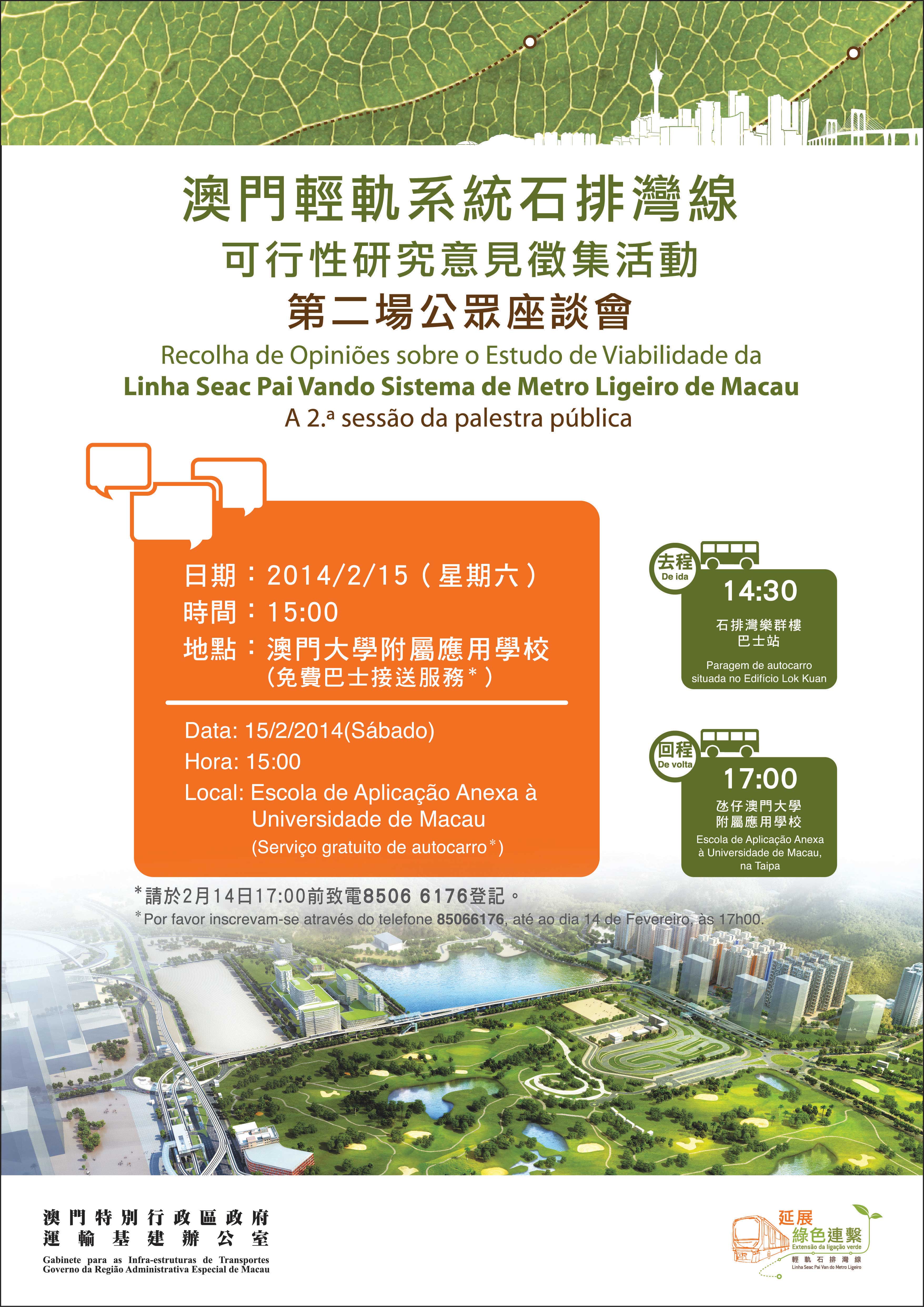 A “Actividade da Recolha de Opiniões sobre o Estudo da Viabilidade da Linha Seac Pai Van do Sistema de Metro Ligeiro de Macau” é realizada pelo Gabinete para as Infra-estruturas de Transportes (GIT) durante o período compreendido entre 10 de Janeiro e 23 de Fevereiro, no intuito de tomar conhecimentos das opiniões e pontos de vista dos sectores sociais sobre a extensão da linha do Metro Ligeiro até à zona de Seac Pai Van. Com vista a encorajar a participação do público, designadamente a apresentação das opiniões pelos moradores da Habitação Pública de Seac Pai Van, o GIT organizará a 2.ª sessão da palestra pública no sábado (dia 15), pelas 15 horas, no Auditório da Escola de Aplicação Anexa à Universidade de Macau, 1.º andar. Neste dia, o mesmo vai apresentar aos participantes não só o planeamento da Linha Seac Pai Van do Metro Ligeiro, como também as propostas preliminares através do vídeo, sendo bem-vindos os cidadãos a participar e discutir em conjunto.