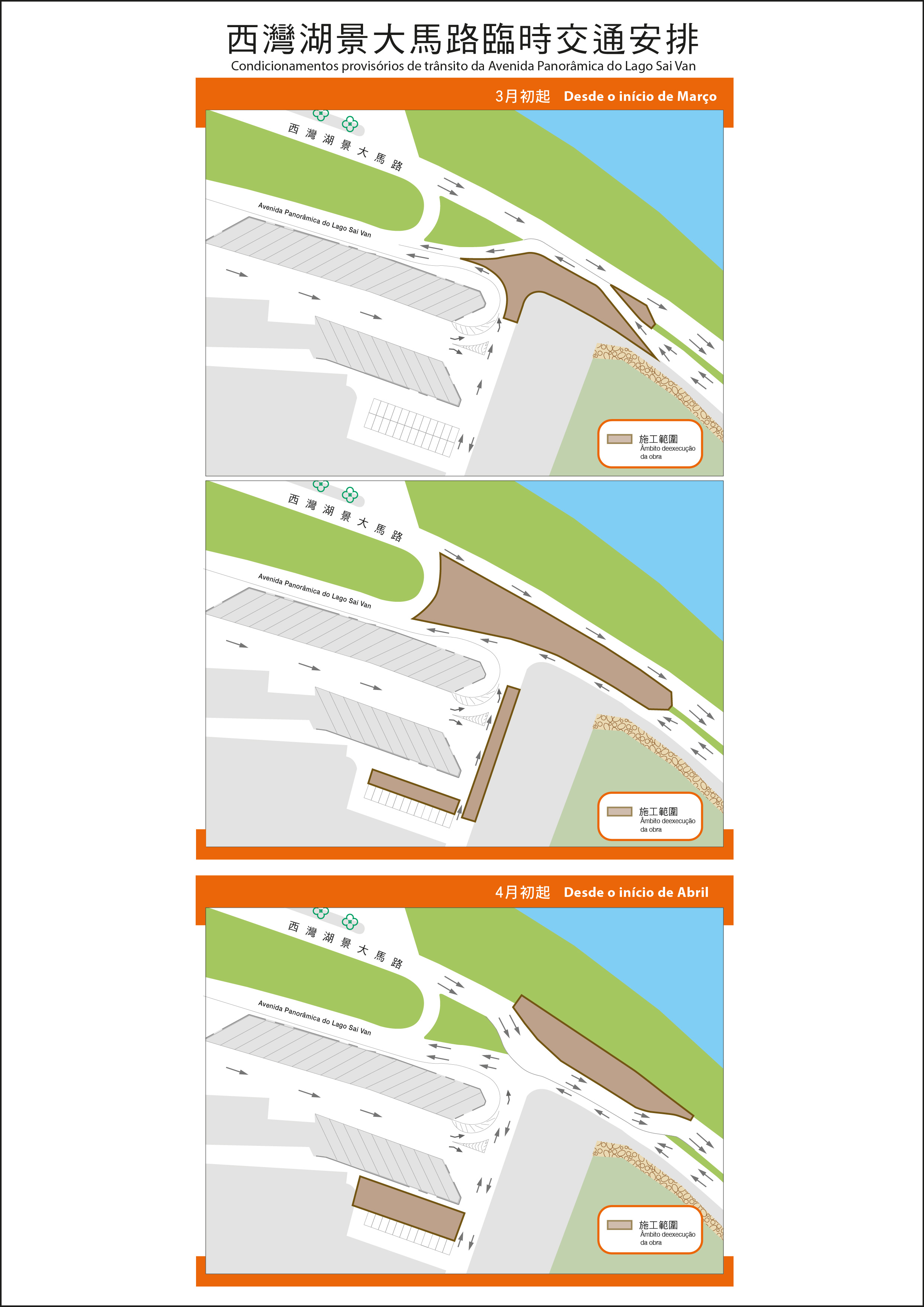 Com vista às necessidades de execução das obras, a partir do início de Março, será ajustada por fases pelo empreiteiro a área de vedação provisória na Avenida Panorâmica do Lago Sai Van, junto do terminal da Barra, mantendo-se continuamente a circulação de uma via de duplo sentido nas faixas de rodagem em direcção à Rua do Almirante Sérgio e à Ponte de Sai Van; entre o fim de Março e o início de Abril, a circulação da faixa de rodagem, em direcção à Rua do Almirante Sérgio, voltará a ser em via dupla enquanto a faixa de rodagem, em direcção à Ponte de Sai Van, manter-se-á em via única. Por outro lado, a partir do dia 11 de Março, serão encerrados temporariamente alguns lugares de estacionamentos para veículos ligeiros no auto-silo provisório da Avenida Panorâmica do Lago Sai Van. Além disso, o empreiteiro prevê a conclusão da obra na última quinzena de Abril, pelo que serão retomadas plenamente a circulação de duas vias de dois sentidos na Avenida Panorâmica do Lago Sai Van e a utilização dos lugares de estacionamento do auto-silo provisório, por forma a minimizar o impacto de trânsito causado pela execução de obras.