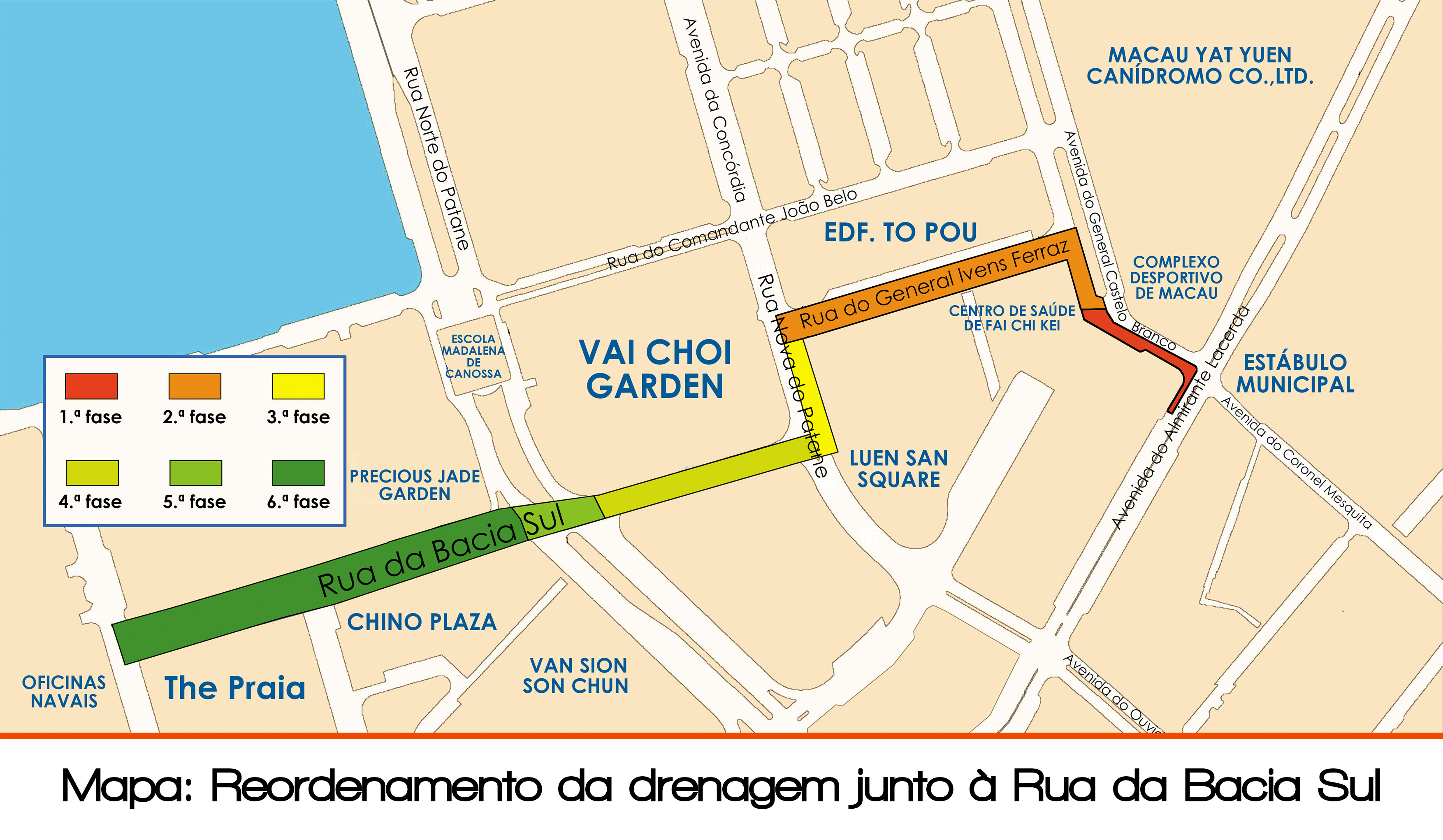 Face ao rápido desenvolvimento do Bairro do Fai Chi Kei e no intuito de aumentar a capacidade de drenagem desta zona, terá a DSSOPT em breve início a execução dos trabalhos referentes ao Reordenamento da Drenagem junto à Rua da Bacia Sul, no sentido de substituir os colectores de água residual actualmente existentes na Rua da Bacia Sul, na Rua Nova do Patane, na Rua do General Ivens Gerraz e na Avenida do General Castelo Branco. Tendo em conta o âmbito da obra compreende sobretudo vários troços das vias, a fim de minimizar o impacto ao trânsito, esta obra será dividida em 6 fases e com o prazo de execução de cerca de 270 dias, pelo que na altura a DSSOPT manterá o diálogo estreito com a DSAT, serão ajustados os condicionamentos provisórios de trânsito em função das circunstâncias concretas da obra.