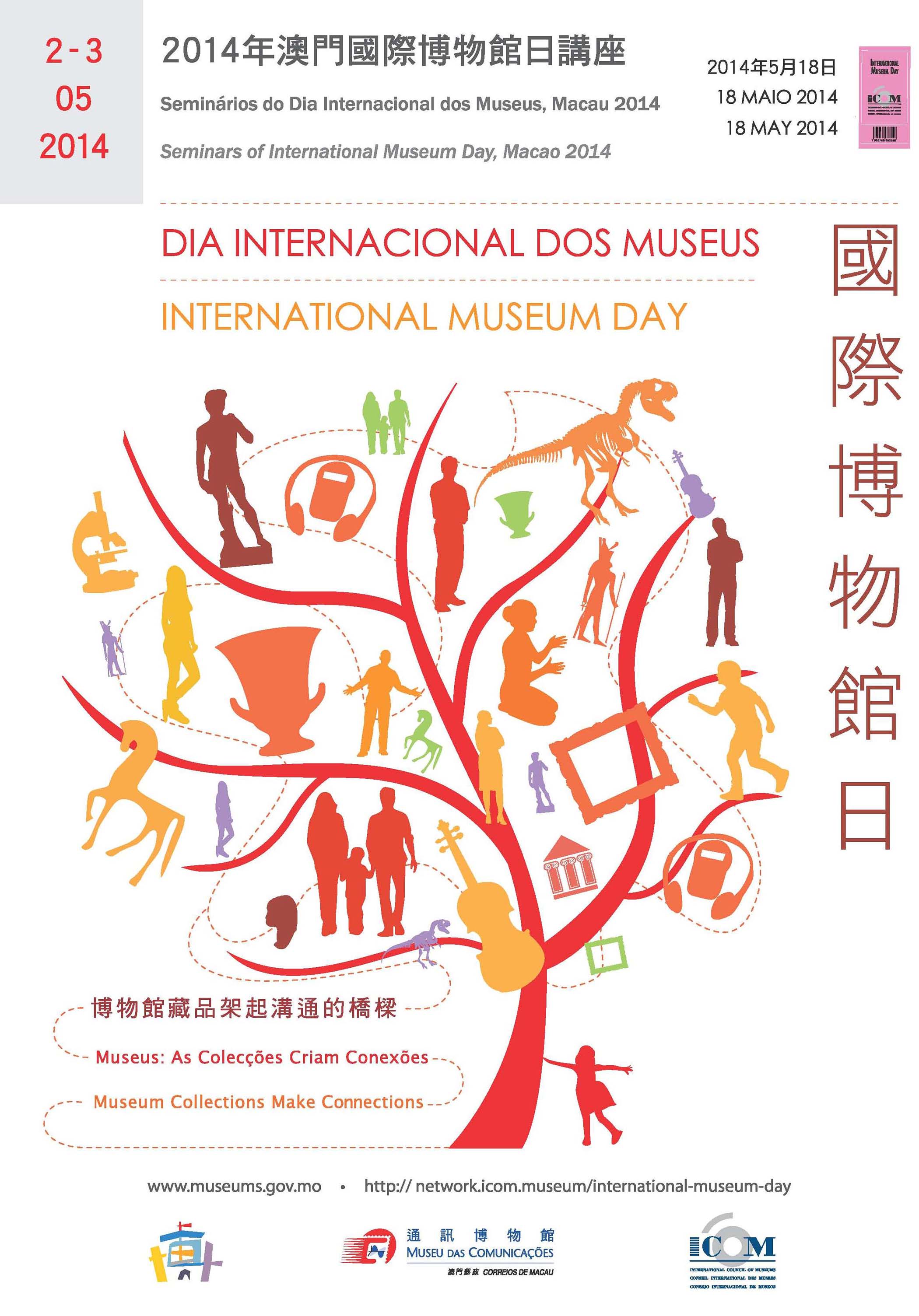 “Museus: As Colecções Criam Conexões”é o tema do Dia Internacional dos Museus 2014, atribuído pelo Conselho Internacional de Museus (ICOM). O Museu das Comunicações irá organizar os Seminários do Dia Internacional dos Museus 2014 nos dias 2 e 3 de Maio, no Auditório do Museu, como prelúdio à celebração do Dia Internacional dos Museus este ano.