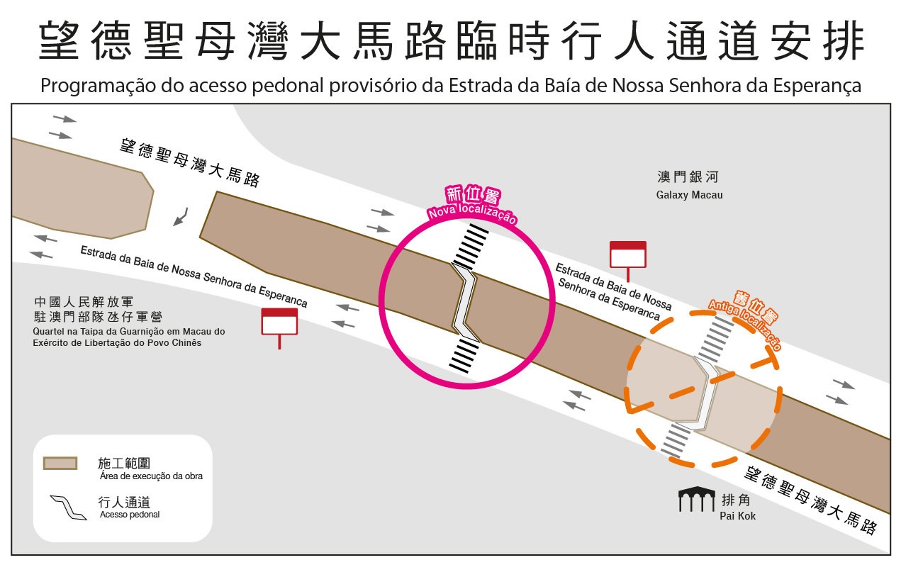 Com vista à construção do viaduto da Linha da Taipa do Metro Ligeiro, o acesso pedonal existente, localizado na Estrada da Baía de Nossa Senhora da Esperança, em frente de Pai Kok, será movido horizontalmente a 60 metros, em direcção à Guarnição em Macau do Exército de Libertação do Povo Chinês (vide em anexo). Atendendo à entrada em serviço do novo acesso pedonal a partir de hoje (dia 10), o Gabinete para as Infra-estruturas de Transportes (GIT) e a Direcção dos Serviços para os Assuntos de Tráfego (DSAT) apelam ao público para dar atenção aos condicionamentos de trânsito e às sinalizações no local.
