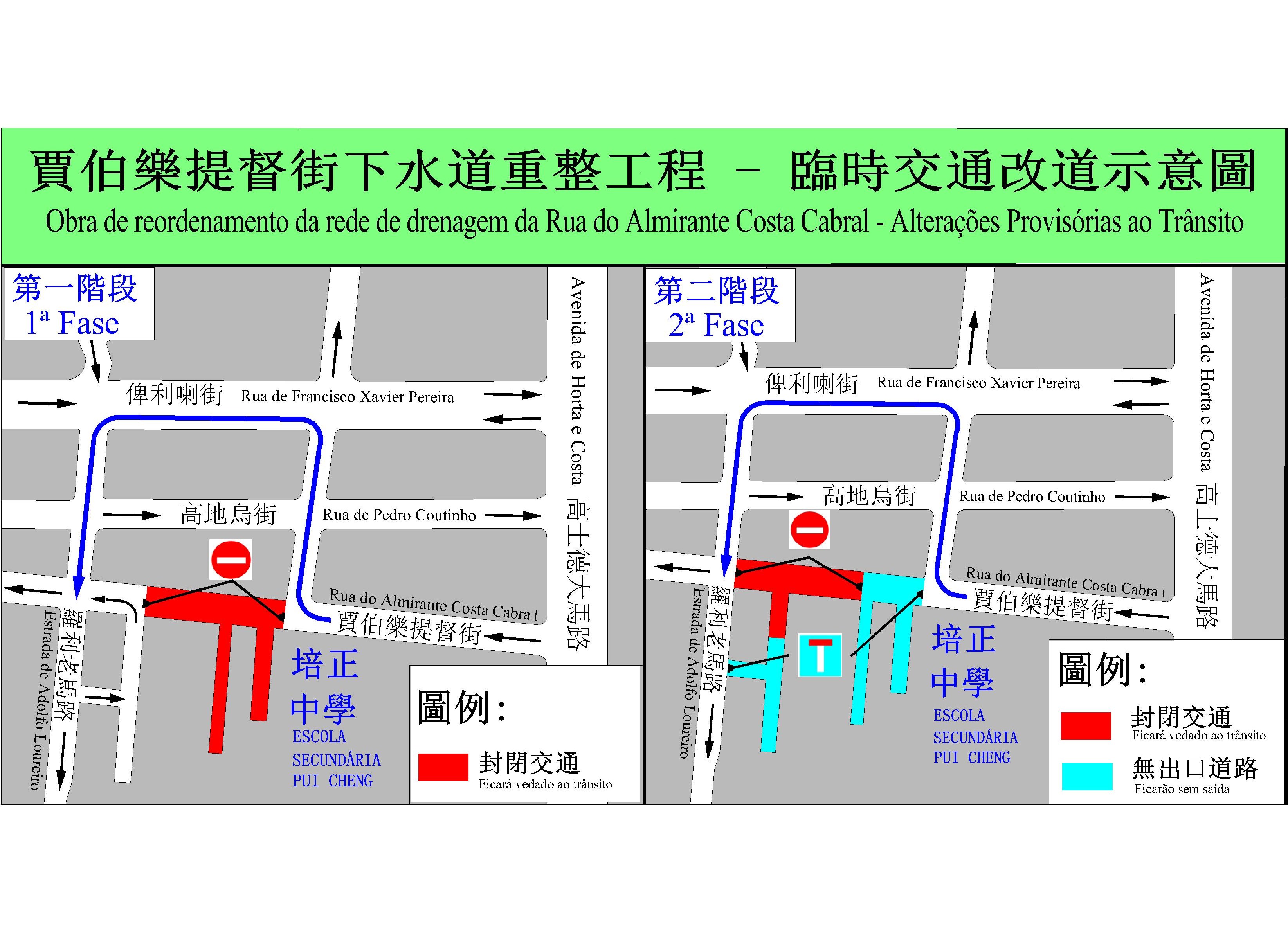 Toda a obra será dividida em 2 fases e a 1.ª fase da obra, com início no troço da Rua do Almirante Costa Cabral, compreendido entre a Rua de Fernão Mendes Pinto (junto do acesso de entrada e saída do estacionamento da Escola Pui Ching) e a Travessa do Almirante Costa Cabral, terá um prazo de execução de 40 dias. Em harmonia com a execução da obra, a partir das 10:00 horas do próximo sábado (dia 10 do corrente mês) será provisoriamente interditado o trânsito e proibido o estacionamento neste troço da Rua do Almirante Costa Cabral, no Pátio da Eterna União e na Rua do Paraíso. Com o estreitamento da via pública devido à execução da obra, a fim de não afectar o trânsito, serão também provisoriamente desactivados os lugares de estacionamento com parquímetro e a zona de estacionamento para motociclos localizados na Rua do Almirante Costa Cabral, na Rua de Fernão Mendes Pinto, na Rua de Pedro Coutinho, na Estrada de Adolfo Loureiro e junto da antiga moradia de Ip Teng