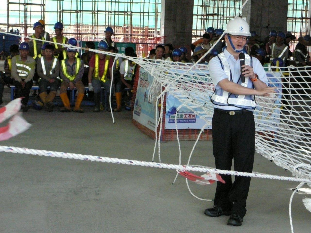 Além disso, para os trabalhadores da construção civil compreenderem os riscos e o perigo de queda em altura, bem como o impacto causado por aquelas, a palestra incluiu uma sessão prática, tendo sido pedido aos trabalhadores para segurar uma rede de protecção previamente preparada, simulando depois a queda de um manequim de tamanho e peso natural, para observarem a diferença entre o uso e o não uso de equipamentos de protecção anti-queda e ao mesmo tempo sentirem o impacto gerado pela queda. Esta sessão prática permite aos trabalhadores da construção civil aprofundar os seus conhecimentos e experiência sobre os riscos dos trabalhos em altura, fazendo-os lembrar espontaneamente que nos trabalhos em altura devem cumprir sempre as regras de segurança e utilizar plataformas de trabalho e equipamento de protecção individual adequados. Durante a palestra, o director da DSAL, Wong Chi Hong, trocou opiniões com os encarregados de segurança das obras e trabalhadores da linha da frente, tendo apelado aos empreiteiros para assegurarem efectivamente uma boa gestão de segurança nos estaleiros, a fim de proteger a segurança e a saúde dos trabalhadores.