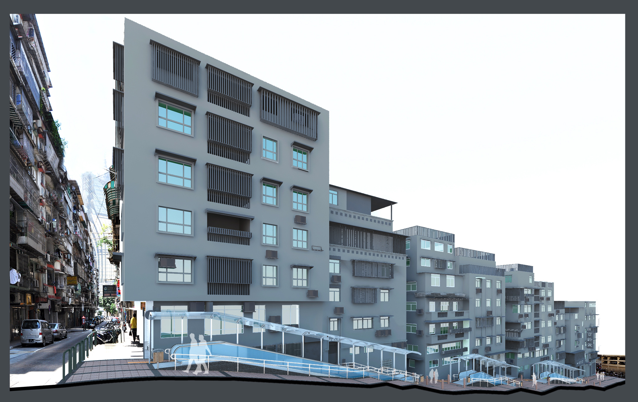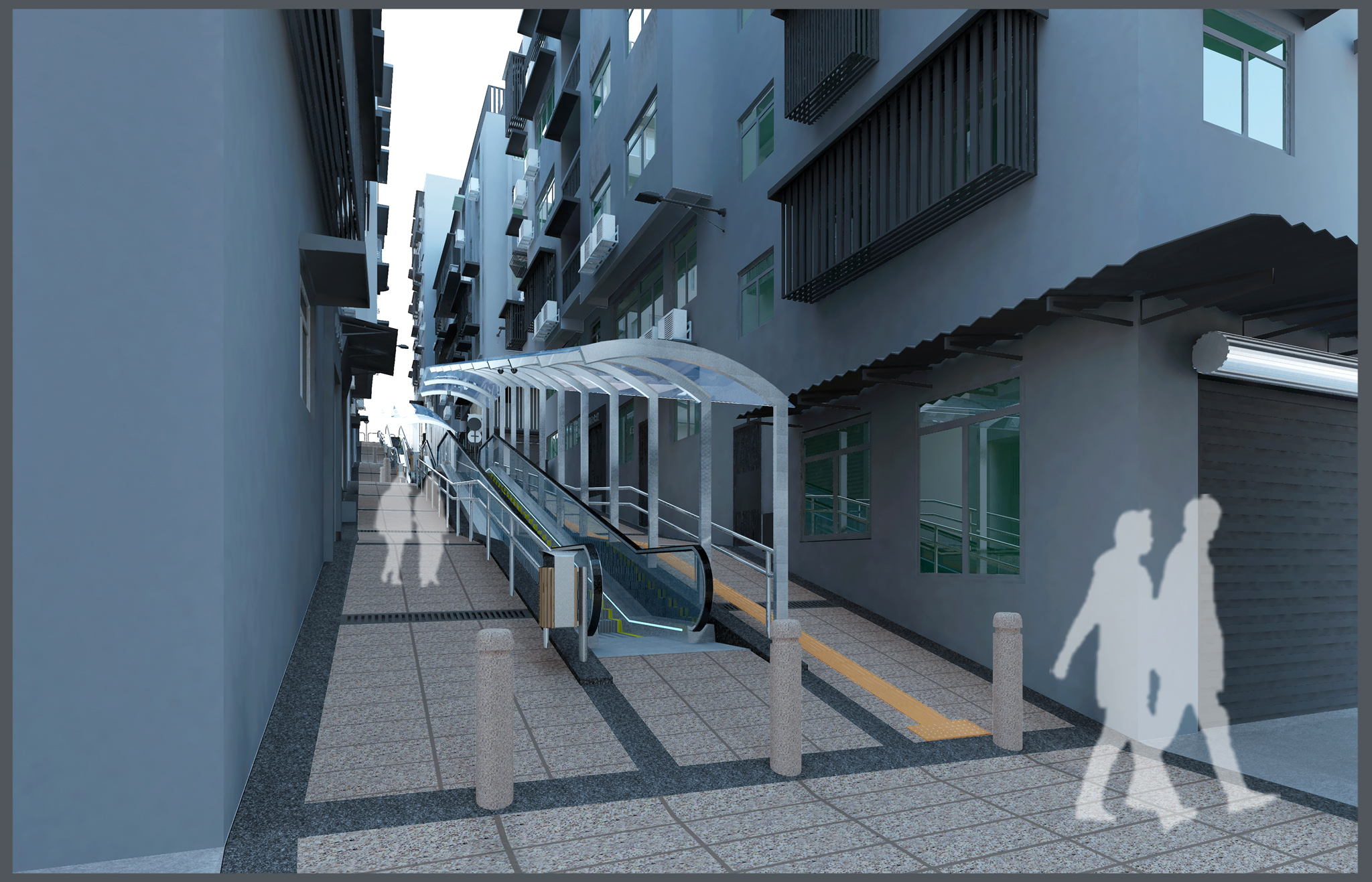 Em termos concepcionais o sistema de escada rolante articulará com o ambiente envolvente e proceder-se-á também ao embelezamento das vias públicas, incluindo a execução dum piso anti-derrapante característico. Considerando que nas suas laterais se encontram vários edifícios habitacionais, a cobertura semicircular deste sistema será executada com materiais leves de modo a não poder suportar o peso de uma pessoa, evitando assim que as pessoas possam trepar até a cobertura, salvaguardando então por um lado a segurança da vida e dos bens dos cidadãos, mas também por outro não obstruir as operações de salvamento dos bombeiros.