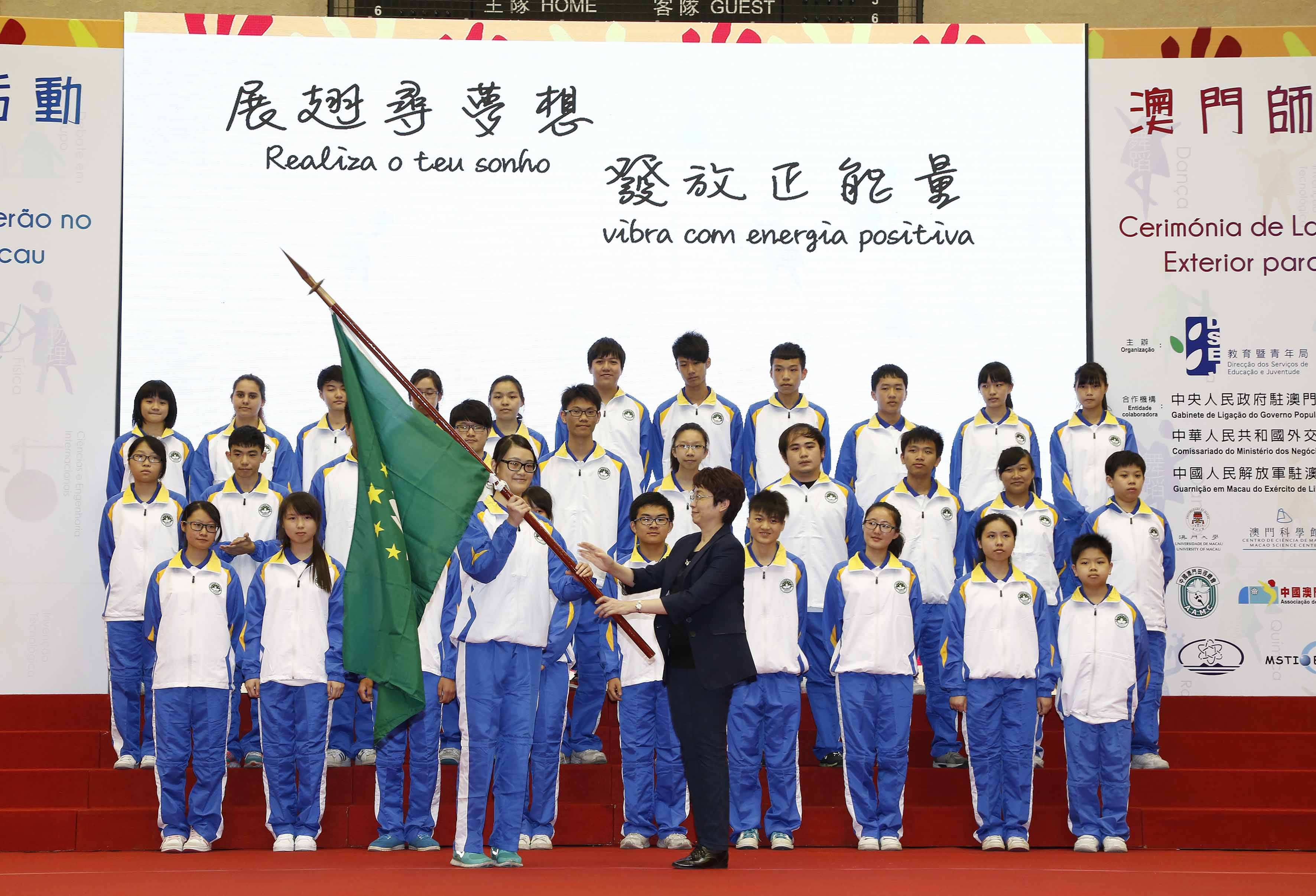 Os representantes dos professores e dos alunos receberam a bandeira da RAEM, das mãos da chefe da delegação Leong Lai, simbolizando a prontidão de todos para se deslocarem a diferentes locais, em representação da RAEM, para aí realizarem intercâmbio e aprendizagem, para contribuírem, no futuro, com os conhecimentos adquiridos para o desenvolvimento social. Lou Pak Sang incentivou, no seu discurso, os professores e alunos das delegações a obterem mais experiências de vida e mais conhecimentos, a reforçarem a sua capacidade competitiva e a criarem uma rede interpessoal mais ampla através da participação nos diversos tipos de actividades. Durante a cerimónia foram apresentados vídeos sobre a participação dos estudantes em competições anteriores e em actividades de intercâmbio e convidados representantes dos professores e dos alunos para, no palco, partilharem os destaques e experiências adquiridas nas actividades do ano anterior, bem como para exporem os seus sentimentos e expectativas no momento antes da partida para as actividades deste ano. Os coros das Escolas Kao Yip e Escola da Sagrada Família deslumbraram com as suas actuações, tendo a cerimónia decorrido com sucesso graças ao apoio prestado pelos voluntários da Escola Luso-Chinesa Técnico-Profissional.