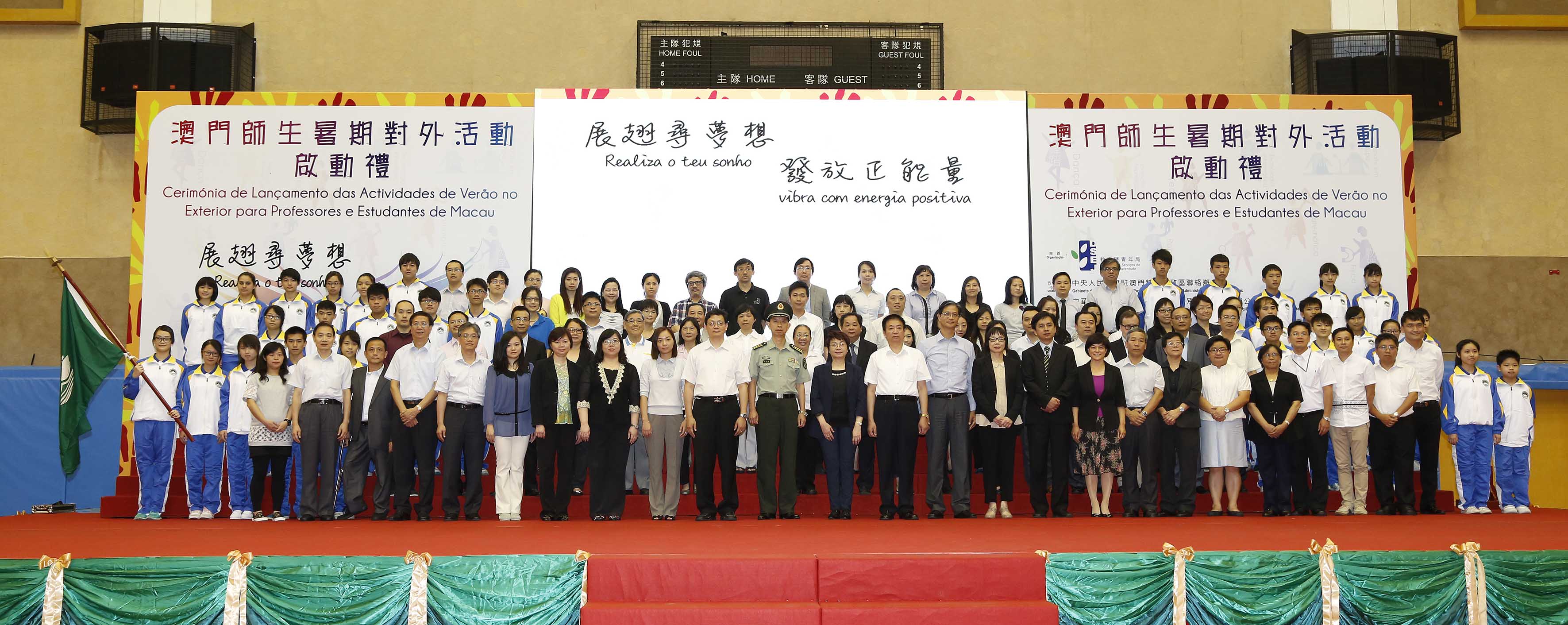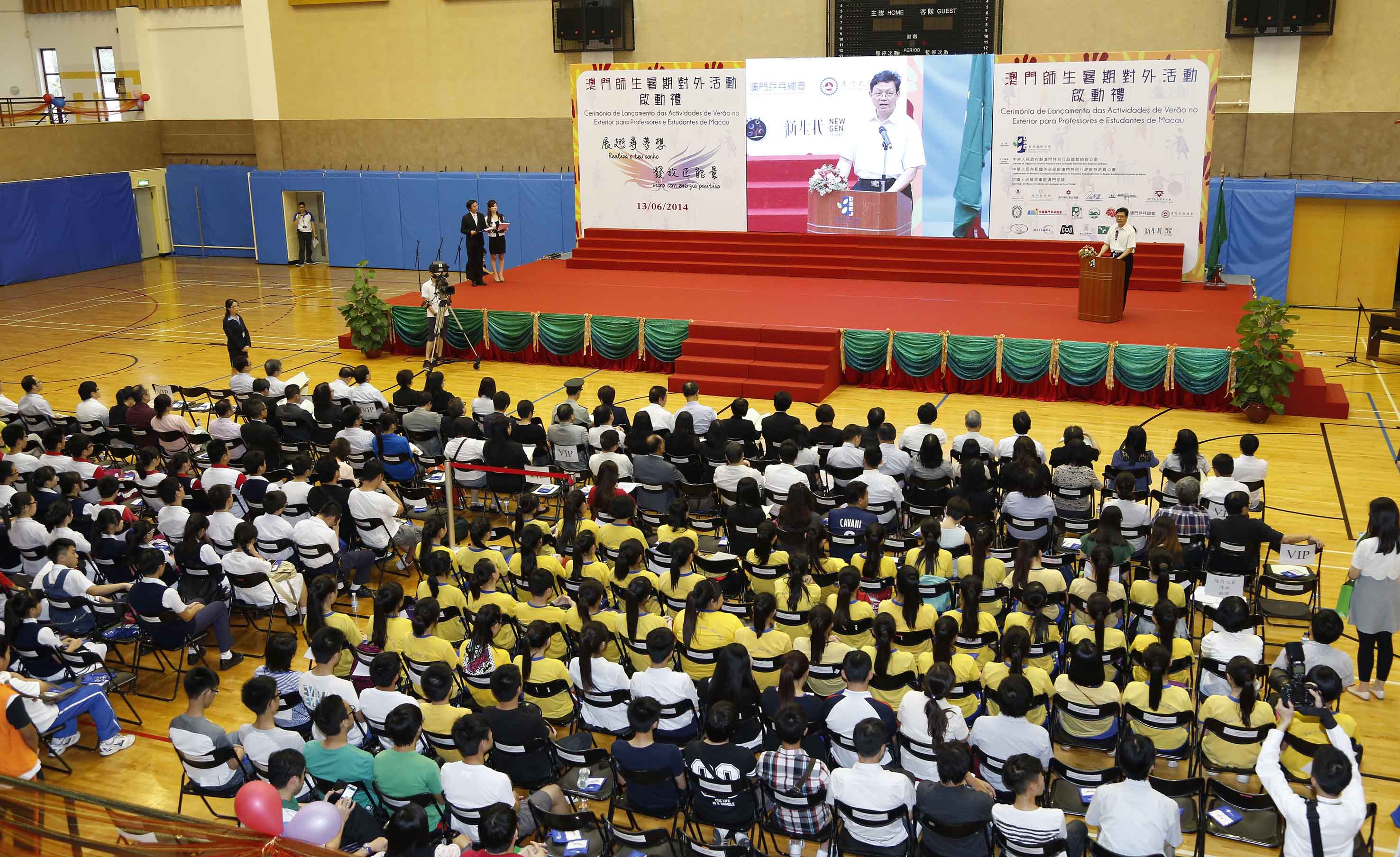 A “Cerimónia de Lançamento das Actividades de Verão no Exterior para Professores e Estudantes de Macau”, teve lugar na tarde do dia 13 de Junho, no Pavilhão Desportivo da Escola Luso-Chinesa Técnico-Profissional, e contou com a presença da Directora dos Serviços de Educação e Juventude, Mestre Leong Lai, do Chefe do Departamento de Cultura e Educação do Gabinete de Ligação do Governo Popular Central da República Popular da China na RAEM, Dr. Liu Xiaohang, do Chefe do Serviço Logístico da Guarnição em Macau do Exército de Libertação do Povo Chinês, Coronel Superior Li Huizhong, do Assessor do Gabinete do Secretário para os Assuntos Sociais e Cultura, Dr. Wai Cheng Iong, do Subdirector da Direcção dos Serviços de Educação e Juventude, Dr. Lou Pak Sang, da Subdirectora da Direcção dos Serviços de Educação e Juventude, Dra. Kuok Sio Lai e ainda de vogais do Conselho de Educação para o Ensino Não Superior, do Conselho de Juventude e do Conselho Profissional do Pessoal Docente, representantes das entidades colaboradoras, os directores das escolas e das delegações, envolvendo, ao todo, mais de 1.000 professores e estudantes.