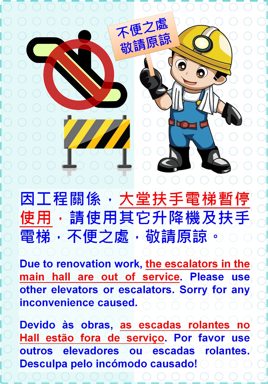 As escadas rolantes mais usadas pelos passageiros no Hall do primeiro piso do Terminal Marítimo do Porto Exterior estão em utilização há mais de 20 anos desde a inauguração do terminal. A partir de 16 de Junho, as escadas rolantes vão ficar fora de serviço e estão previstas para voltar a funcionar no fim de Setembro, devido à obra de substituição integrada na “Empreitada de Optimização do Espaço do Terminal Marítimo de Passageiros do Porto Exterior”. Os turistas ou cidadãos poderão usar as escadas e os elevadores, ou seja, as escadas rolantes no espaço fora da edificação do terminal, como o meio de locomoção. Em simultâneo com a obra, terão também início a obra de renovação de tectos e chão da área pública e a obra de substituição de elevadores de carga na ala leste.