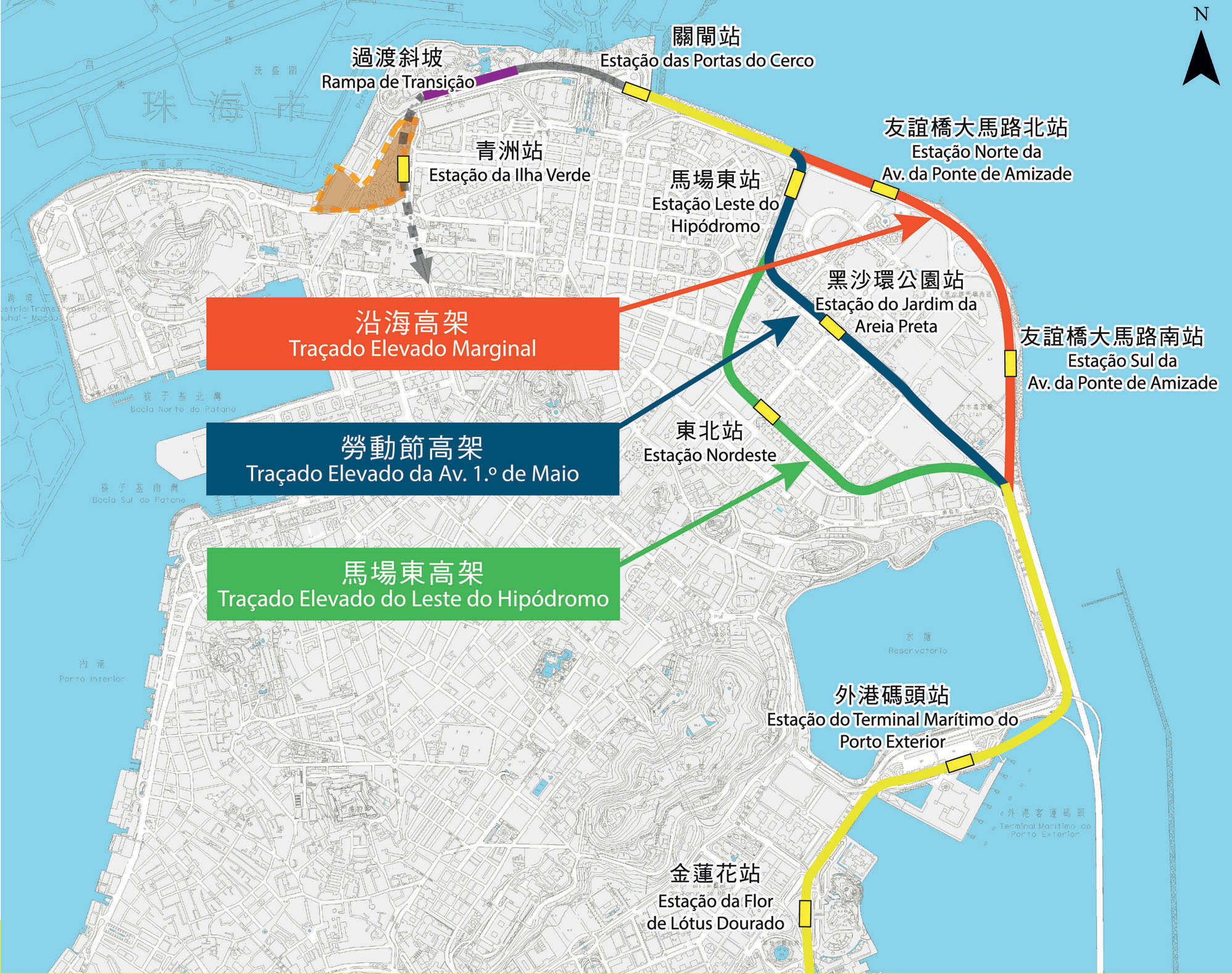 O Segmento Norte da Linha de Península de Macau do Metro Ligeiro tem início na zona Norte da Estação da Flor de Lótus Dourado, ligando à zona Nordeste, uma zona residencial de alta densidade urbana de Macau, até à Estação das Portas do Cerco. Com a integração das necessidades dos desenvolvimentos urbano e social, a equipa técnica de consultoria apresentou três soluções para o traçado em questão, as quais prevêem igualmente a criação das quatro estações. Os três traçados propostos têm início na zona Norte da Estação da Flor de Lótus Dourado, passando pela Avenida de Amizade para ligar à Estação do Terminal Marítimo do Porto Exterior, circulando ao longo do lado Leste do Reservatório; passando pelo canto Norte do Reservatório, os três traçados propostos vão circular em vias diferentes para articular com a zona Nordeste e a Estação das Postas do Cerco