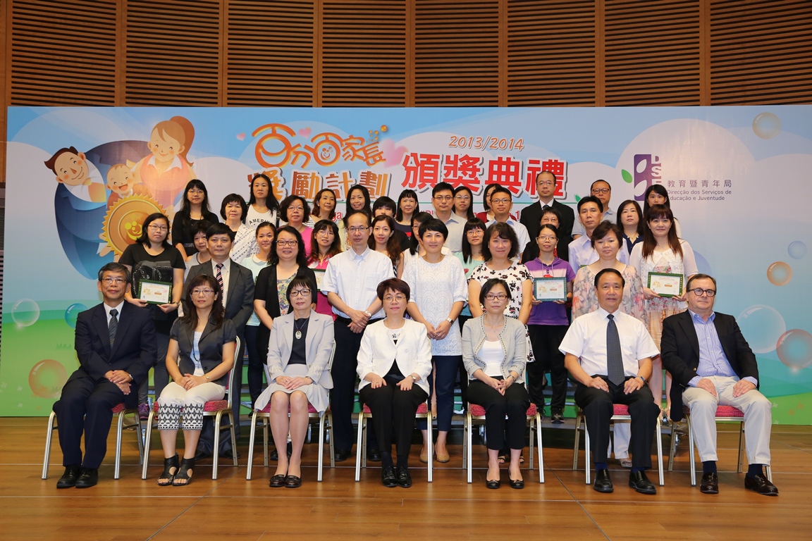 Para distinguir os encarregados de educação que participaram, activamente, nestas actividades, a DSEJ realizou a cerimónia de atribuição de prémios do Plano de Incentivo 100% Pais do ano lectivo 2013/2014,a qual teve lugar no Centro de Convenções do Centro de Ciência de Macau, no dia 27 de Julho, pelas 10:30 horas. Estiveram presentes na cerimónia, a directora e subdirectora da DSEJ, Leong Lai e Kuok Sio Lai, a subdirectora da DSC, Rosa Leong, a chefe da Divisão de Formação e Informação Cívicas do IACM, Lam Mei Sioe mais de 30 representantes das instituições educativas e das associações.
