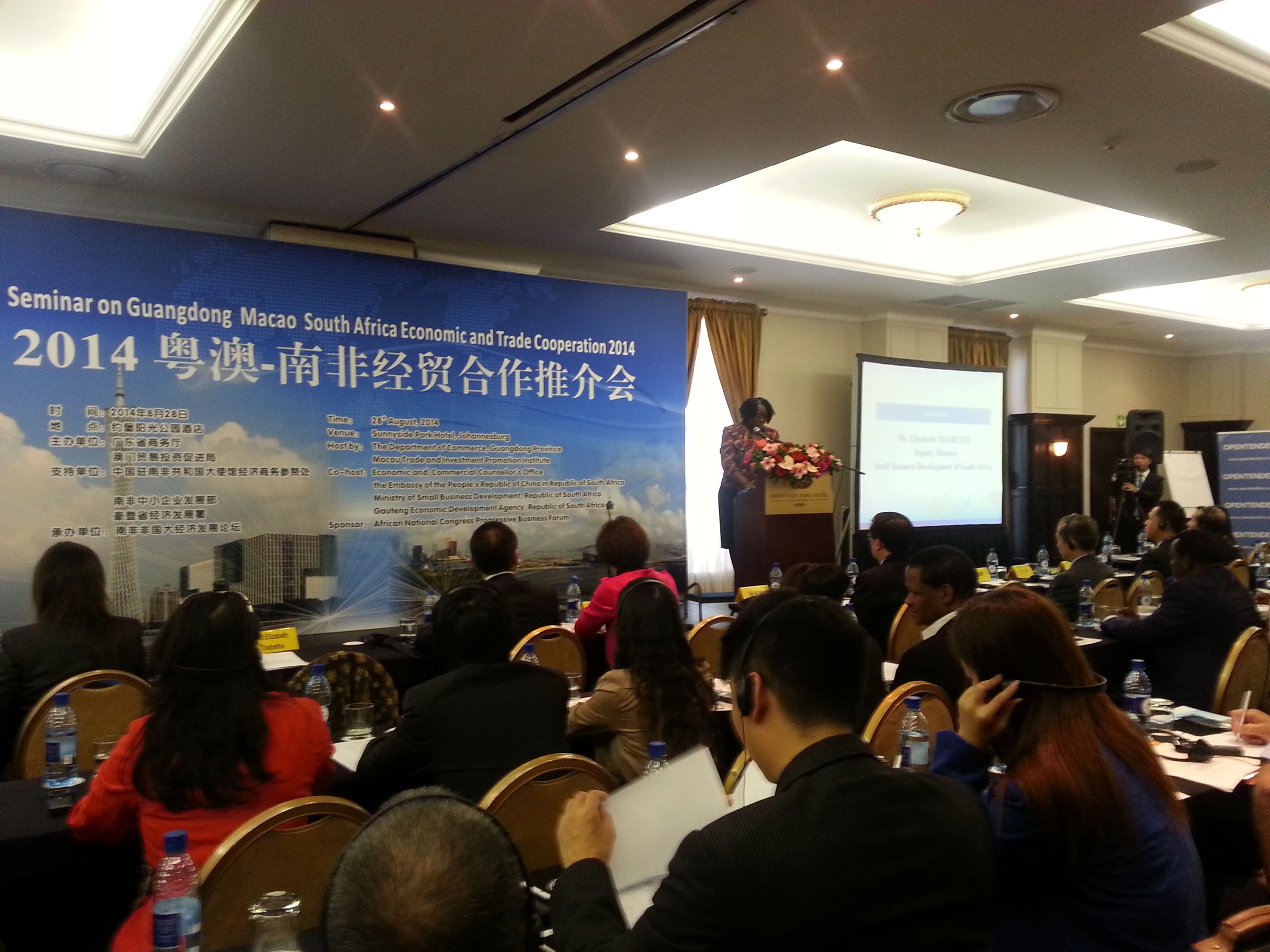 Com vista a promover o intercâmbio e a cooperação entre a Província de Guangdong, Macau, a África do Sul e os Emirados Árabes Unidos, o Instituto de Promoção do Comércio e do Investimento de Macau (IPIM) e o Departamento do Comércio da Província de Guangdong organizaram, em 28 de Agosto de 2014 e 31 de Agosto de 2014, respectivamente, no Sunnyside Park Hotel, em Johannesburgo, África do Sul, e no JW Marriot Marquis Hotel, em Dubai, Emirados Árabes Unidos, o Seminário para a Promoção da Cooperação Económica e Comercial entre Guangdong, Macau e a África do Sul e o Seminário para a Promoção Económica e Comercial entre a Guangdong, Macau e os Emirados Árabes Unidos (EAU).
