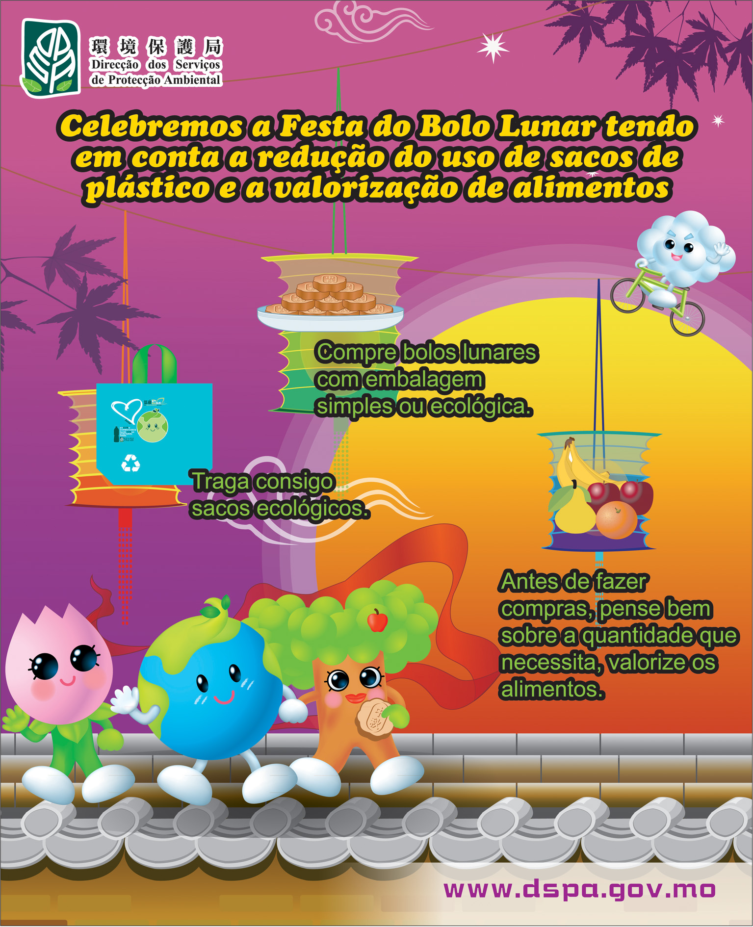 A Festa do Bolo Lunar é uma festa tradicional para a reunião de todos os membros da família. Segundo a tradição, para além de se comer o bolo lunar, apreciar a lua e brincar com as lanternas, também devemos dedicar as nossas forças à protecção atmosférica e ambiental. A Direcção de Serviços de Protecção Ambiental (DSPA) apela a todos os cidadãos que, ao mesmo tempo que celebram esta festa familiar, não se esqueçam de apoiar as ideias ecológicas de “reduzir o uso de sacos de plástico” e “valorizar os alimentos”.