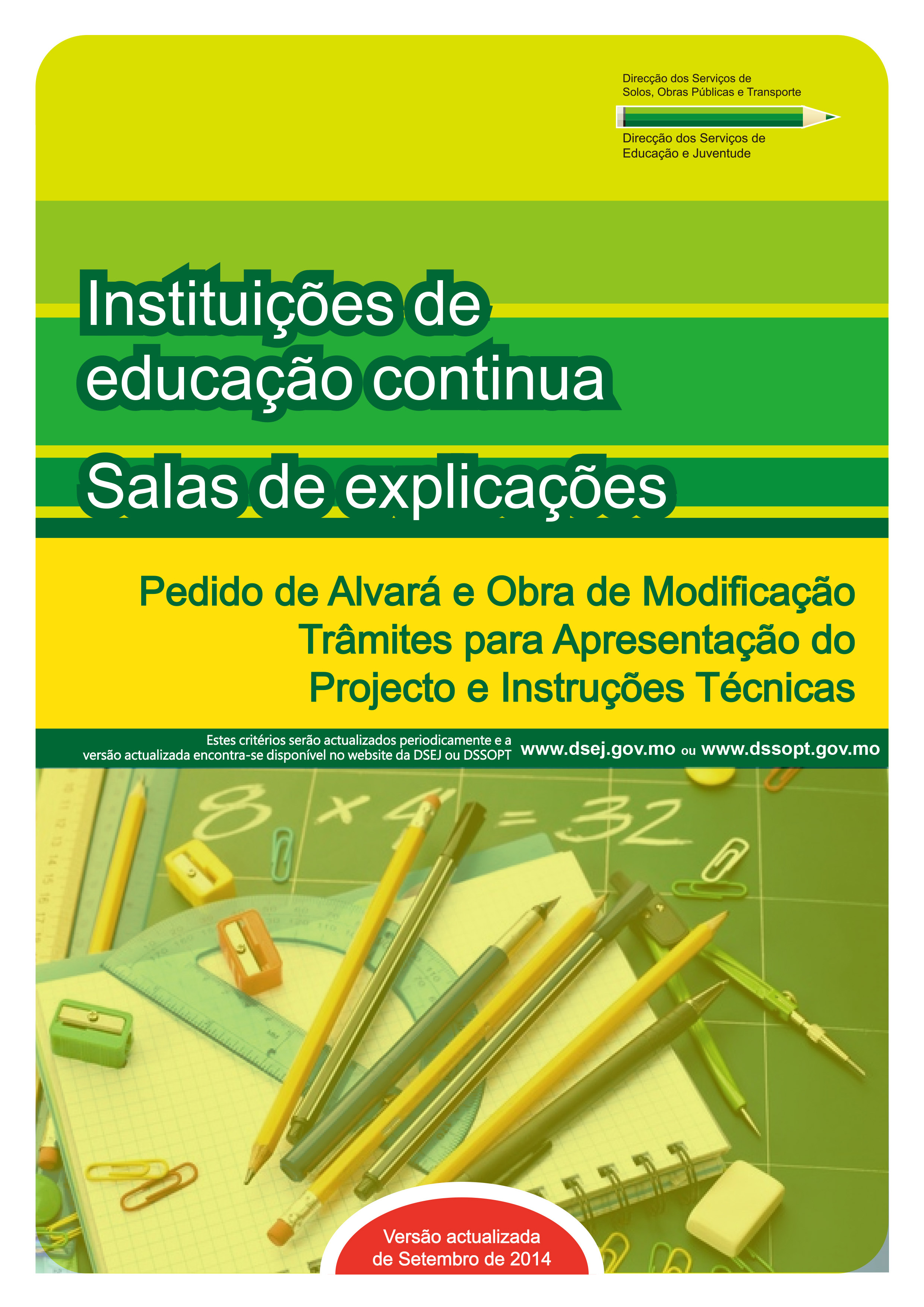 Atendendo a necessidade dos requerentes de alvará para a exploração das instituições de educação e salas de explicação (incluindo salas de estudo e centros de explicação) e na sequência do consenso alcançado nas reuniões realizadas entre a DSSOPT e a DSEJ para a desburocratização dos trâmites de apreciação do pedido dirigido a cada um dos serviços, foi decidido a actualização conjunta das instruções de cada um dos serviços e a criação conjunta com o CB e SS dos Trâmites para Apresentação do Projecto e Instruções do Pedido de Alvará e Obra de Modificação das Instituições Educativas de Educação Continua e Salas de Explicação. Nestas instruções foram acrescidos os trâmites administrativos e as exigências técnicas relativos aos pedidos de alvará, bem como foi reforçado a sensibilização dirigida aos requerentes quanto aos aspectos que devem ter em conta na entrega dos projectos das obras de modificação, permitindo assim que possam, antes da entrega do pedido, verificar se estão preenchidos todos os requisitos exigidos, reduzindo-se assim a oportunidade de indeferimento e elevando por conseguinte a sua taxa de aprovação.