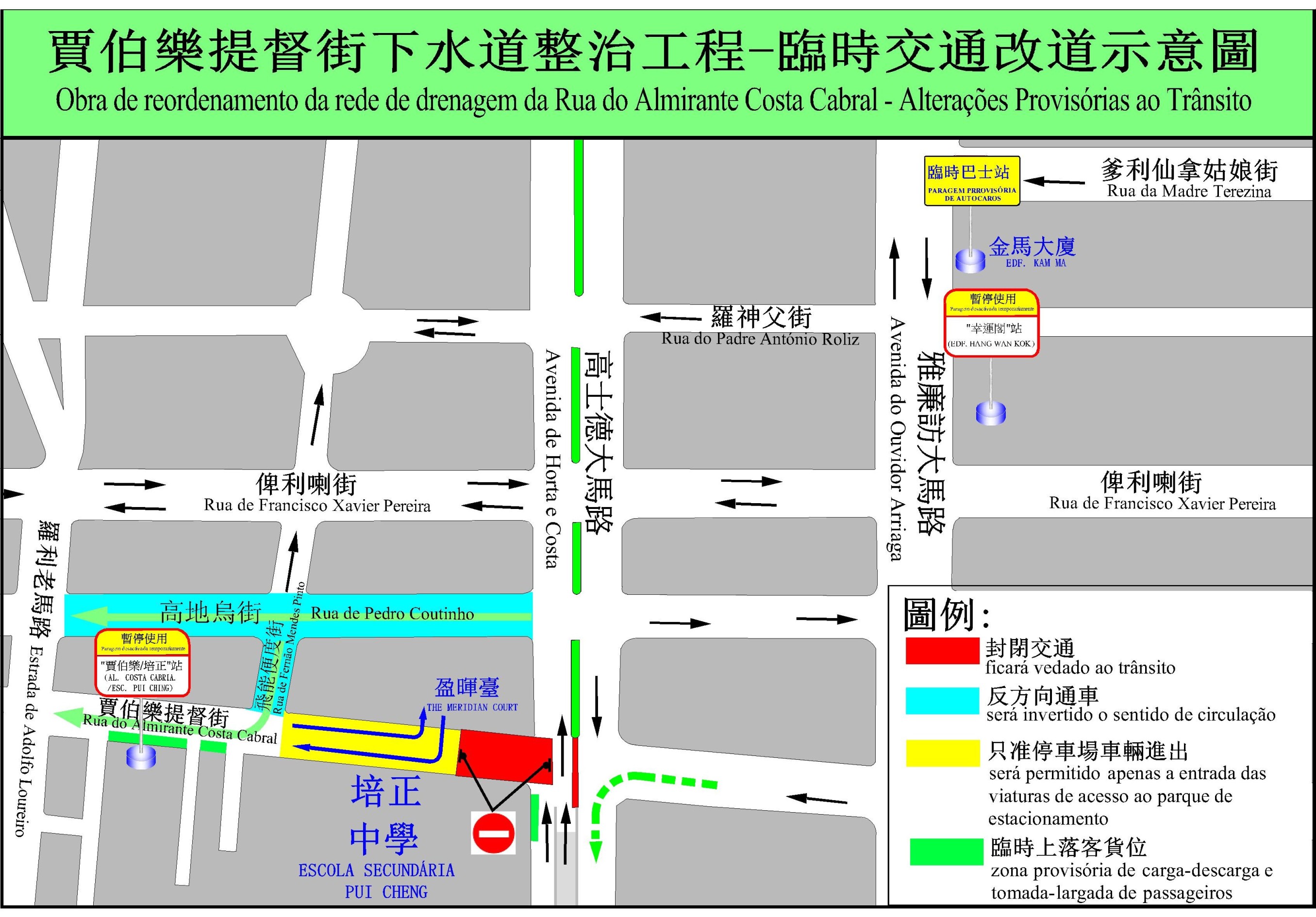 A par disso, será invertido o sentido de circulação no troço da Rua de Fernão Mendes Pinto compreendido entre a Rua de Pedro Coutinho e a Rua do Almirante Costa Cabral, mantendo-se o sentido de circulação da Rua de Pedro Coutinho em direcção da Rua do Almirante Costa Cabral, assim como, a desactivação dos lugares de estacionamento com parquímetro neste troço, o trânsito da Rua do Almirante Costa Cabral somente poderá virar à esquerda em direcção da Avenida de Horta e Costa. A criação provisoriamente a zona para carregamento e descarregamento de mercadoria e tomada e largada de passageiros a tempo inteiro, no troço da Rua do Almirante Costa Cabral, situado junto do Edifício Va Lhung. Além disso, durante a execução da obra, será criado provisoriamente a zona para tomada e largada de passageiros, no troço da Avenida de Horta e Costa, situado junto da Escola Secundária Pui Ching, no período compreendido entre as 07:30 às 08:30 e as 15:30 às 16:30.