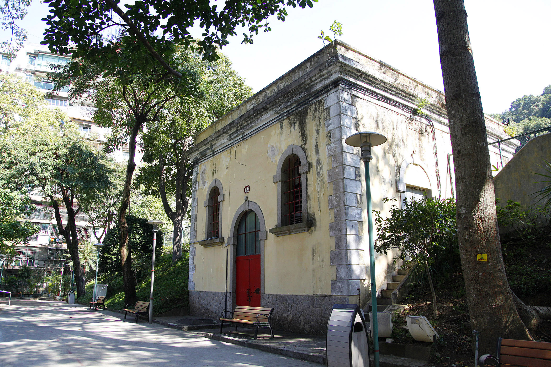 O tanque coberto se encontra localizado a leste da Travessa do Túnel e consiste numa estrutura de tanque coberto, sendo a entrada feita por uma antiga construção de dois pisos. A presente obra tem uma área global de cerca de 3.000 m2 e dividida em três partes. A primeira parte se encontra localizada na construção junto da entrada do tanque, em que será mantido e renovado conforme o parecer do IC, de modo a aumentar o valor patrimonial. A segunda parte consiste na parte principal do tanque coberto, em que se procederá à sua reparação, de modo a construir um tanque coberto, em prol assim do armazenamento de água. A terceira parte consiste na reconstrução da edificação localizada sobre o tanque coberto, mas propriamente junto da colina, que juntamente com a cobertura será entregue à entidade gestora do jardim após a sua construção.