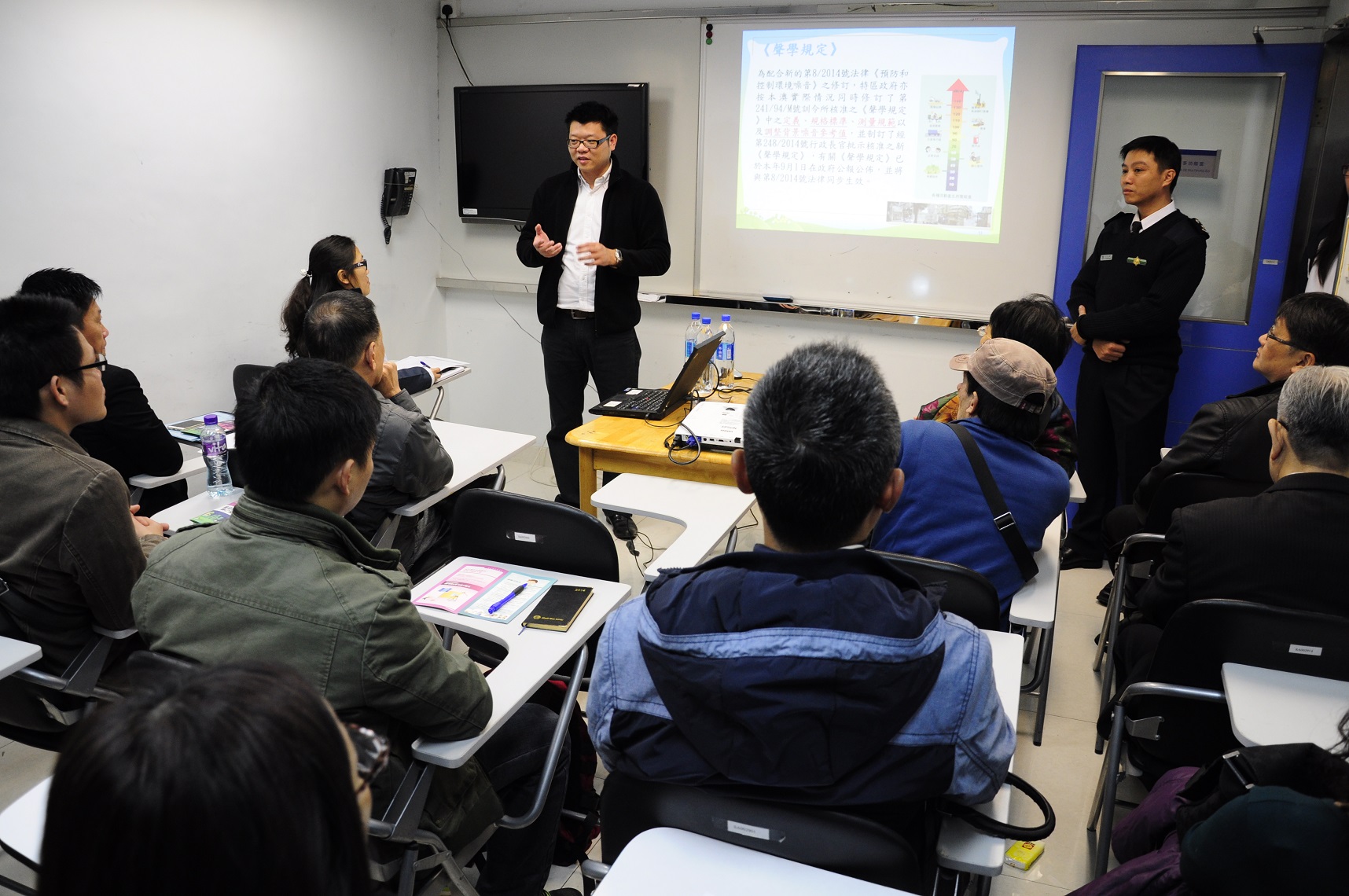 Desde a data da publicação da nova legislação, a DSPA organizou, em colaboração com o Corpo de Polícia e Segurança Pública, a Direcção dos Serviços de Administração e Função Pública, os Serviços de Alfândega, a Direcção dos Serviços para os Assuntos Marítimos e de Água, o Centro de Produtividade e Transferência de Tecnologia de Macau e com algumas associações locais, dez sessões de esclarecimento sobre o contéudo da nova legislação, o seu âmbito de aplicação, o período de controlo e o regime sancionatório, junto dos serviços públicos, sectores de hotelaria e de conferências e exposições, associações, entidades públicas, sectores de aparelhos de ar condicionado e industriais, sectores das obras de modelação e reparação e de construção civil como operadores dos portos e de serviços logísticos. Durante as palestras, as entidades organizadoras responderam e esclareceram dúvidas e sugestões apresentadas pelos intervenientes, reforçando o conhecimento dos diversos sectores respeitantes à nova legislação, para que cumprissem as normas estipuladas na lei, reduzindo os distúrbios do nível sonoro ao ambiente e aos cidadãos. Para reforçar a divulgação junto dos bairros, a DSPA realizou várias sessões de actividades sobre a divulgação jurídica da Lei da Prevenção e Controlo do Ruído, juntamente com as diversas associações, deslocando-se aos bairros para a afixação de cartazes e a distribuição de panfletos aos cidadãos, empresários, moradias e estabelecimentos nocturnos, dando-lhes a conhecer o contéudo da nova legislação e as diferentes medidas necessárias para reduzir o ruído perturbador, com vista a reforçar o conhecimento dos cidadãos sobre a nova legislação e reduzir o ruído perturbador para o bem estar de todos.