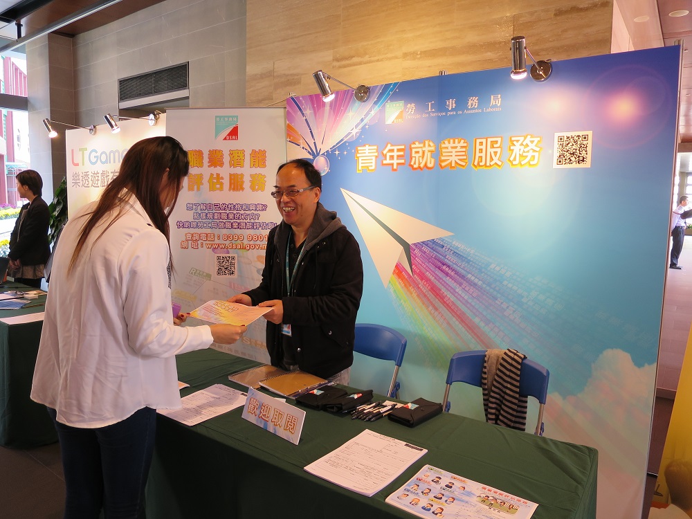 Nos últimos anos, o rápido desenvolvimento económico de Macau tem criado muitas oportunidades de emprego. A fim de ajudar os jovens a seleccionar o emprego adequado e a iniciar a sua carreira profissional com sucesso, no final de Janeiro, a Direcção dos Serviços para os Assuntos Laborais (DSAL) participou no “MPI 2015 Careers Day” do Instituto Politécnico de Macau, tendo instalado tendas para apresentar e promover os seus serviços de apoio ao emprego aos jovens, incluindo workshops de simulação de entrevistas e avaliação de potencialidades profissionais, atraindo muitos estudantes para consultas e inscrições in loco.