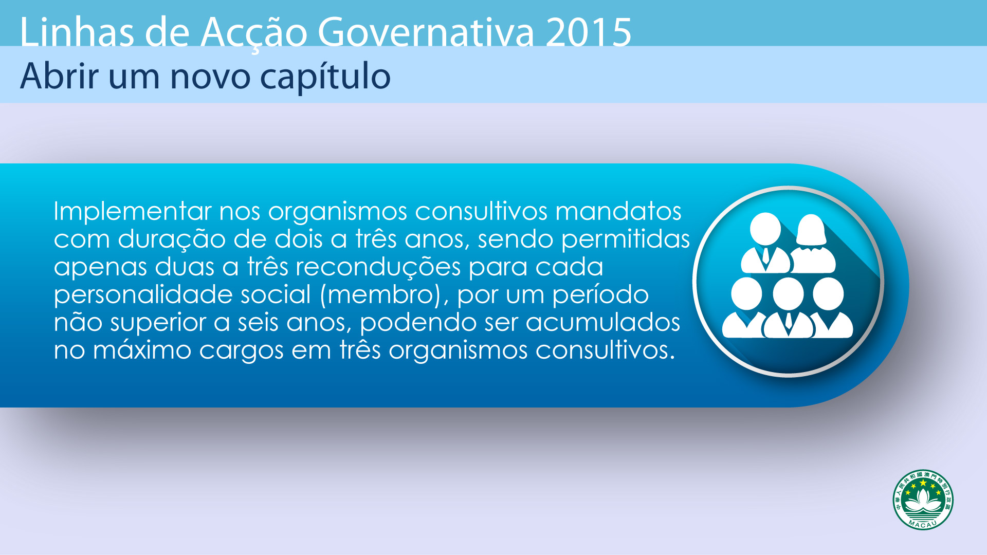 Uma boa governação está estreitamente relacionada com uma governação científica e eficiente, bem como com a participação activa e o apoio dos residentes. Iremos aumentar, de forma contínua, a transparência governativa, e assegurar, de acordo com a lei, as liberdades de imprensa, de edição e de expressão. Iremos intensificar os estudos de políticas, acelerar o ritmo e elevar a qualidade das respostas, aumentar a capacidade de explicação das políticas adoptadas e garantir uma boa interacção entre o Governo, as associações e os residentes. Durante este ano será ainda levada a cabo a reestruturação dos organismos consultivos, e pretendemos implementar mandatos com duração de dois a três anos, sendo permitidas apenas duas a três reconduções para cada personalidade social (membro), por um período não superior a seis anos, podendo apenas ser acumulados cargos em três organismos consultivos.